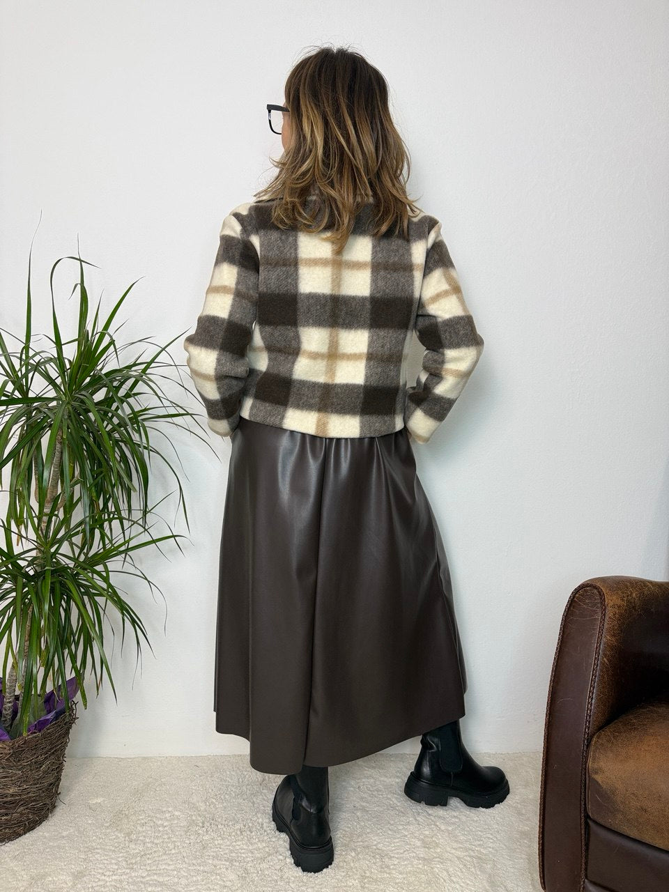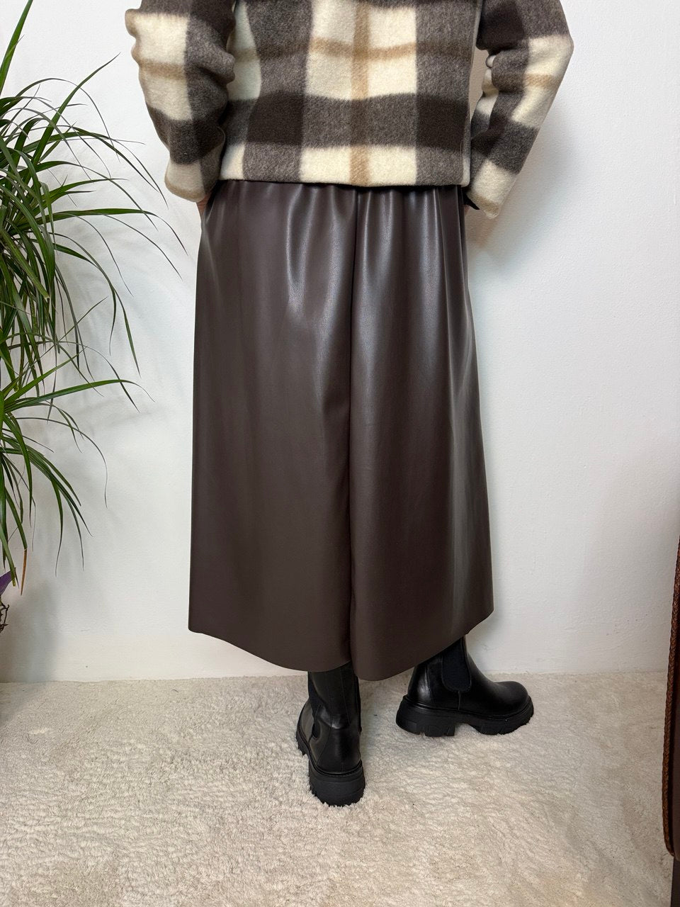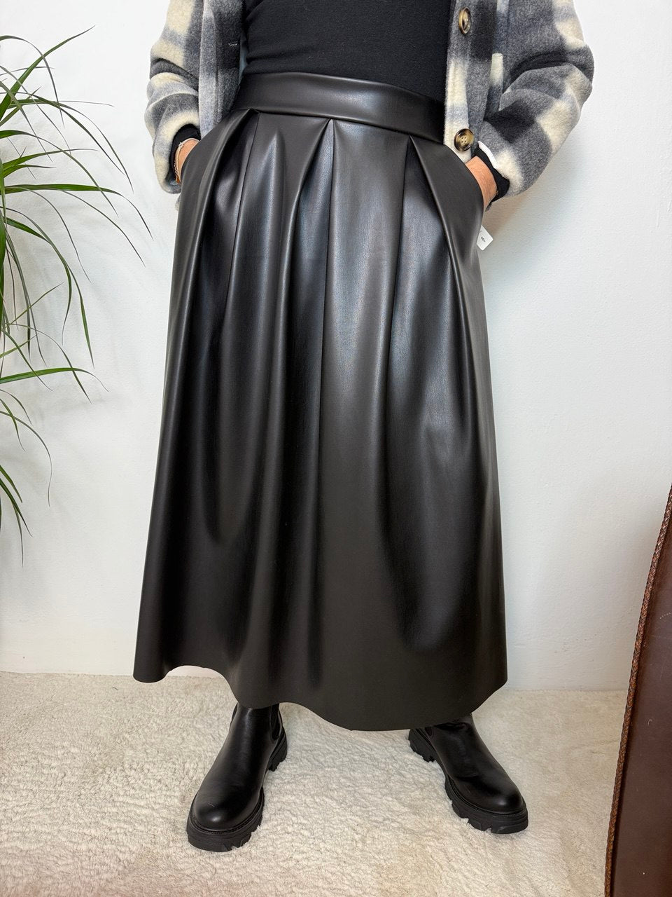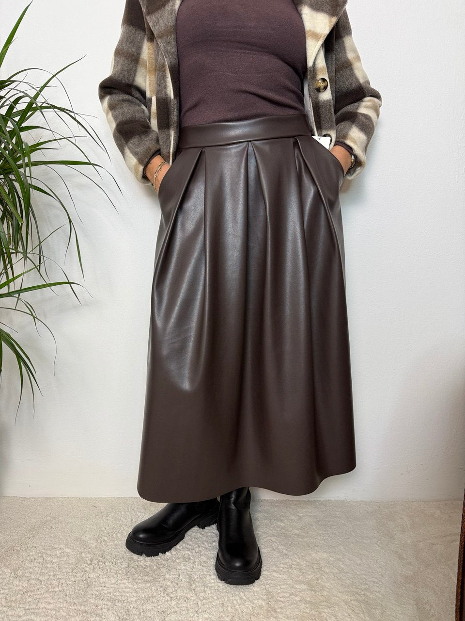 Gonna in eco-pelle con baschina sul davanti, elastico sul retro, tasche laterali, pence sul davanti, tagliata ad orlo vivo sul fondo, vestibilità dalla taglia 46 alla 50