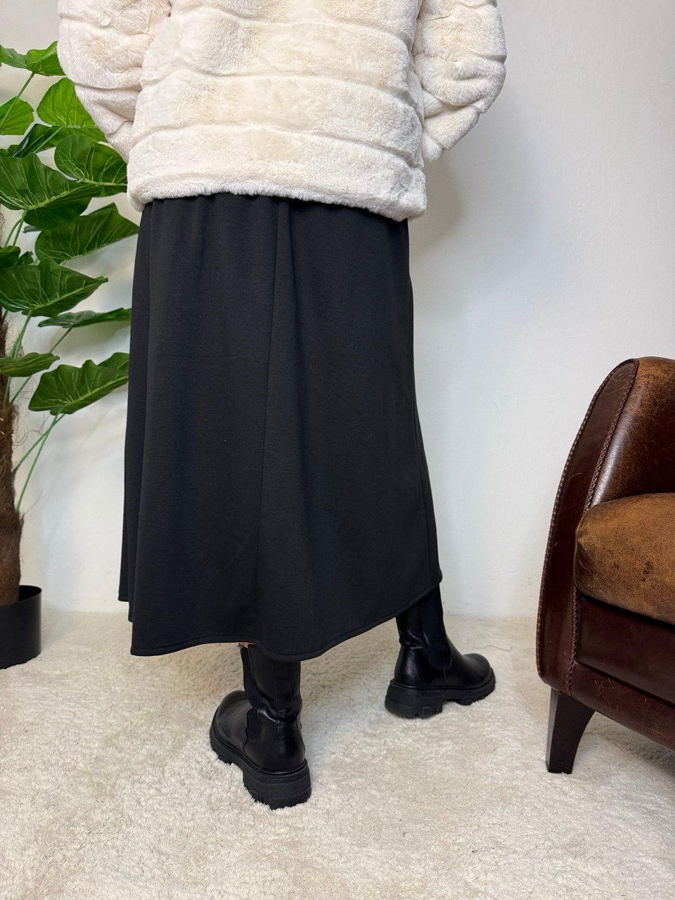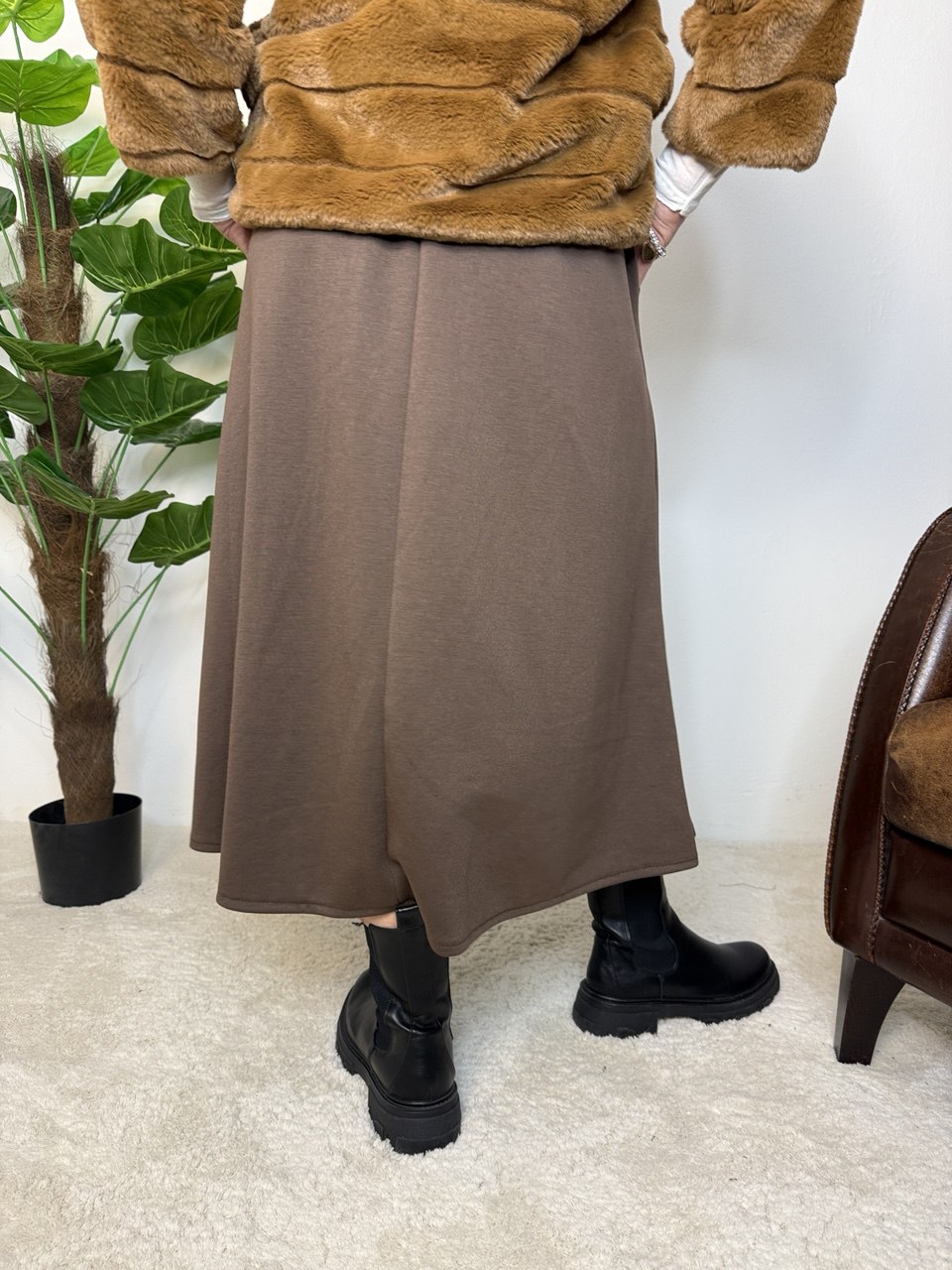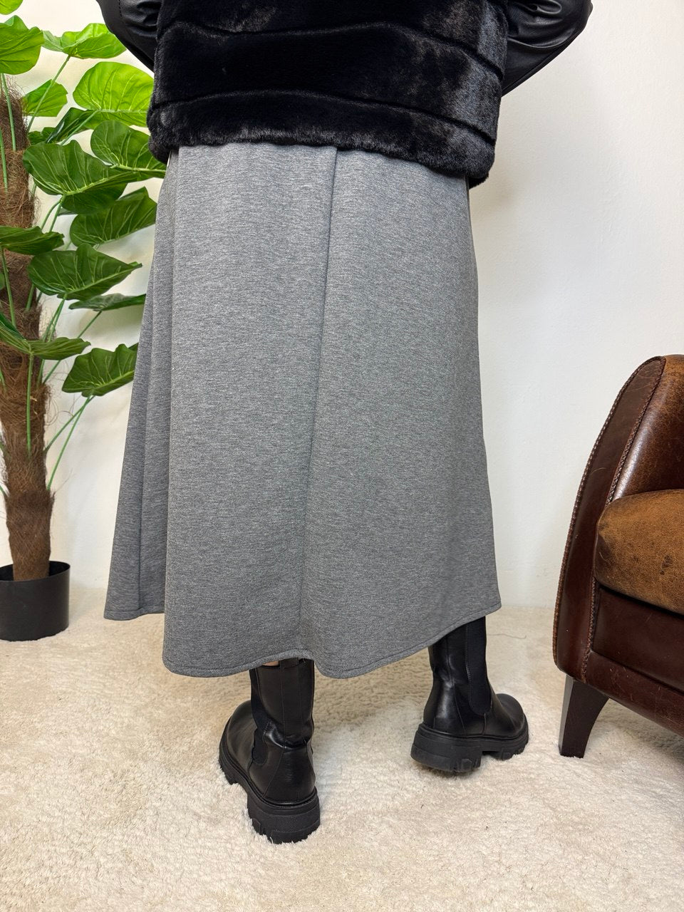 Gonna in tessuto simile alla felpa, baschina sul davanti, elastico sul retro, pence solo sul davanti, tasche, vestibilità dalla taglia 44 alla 48