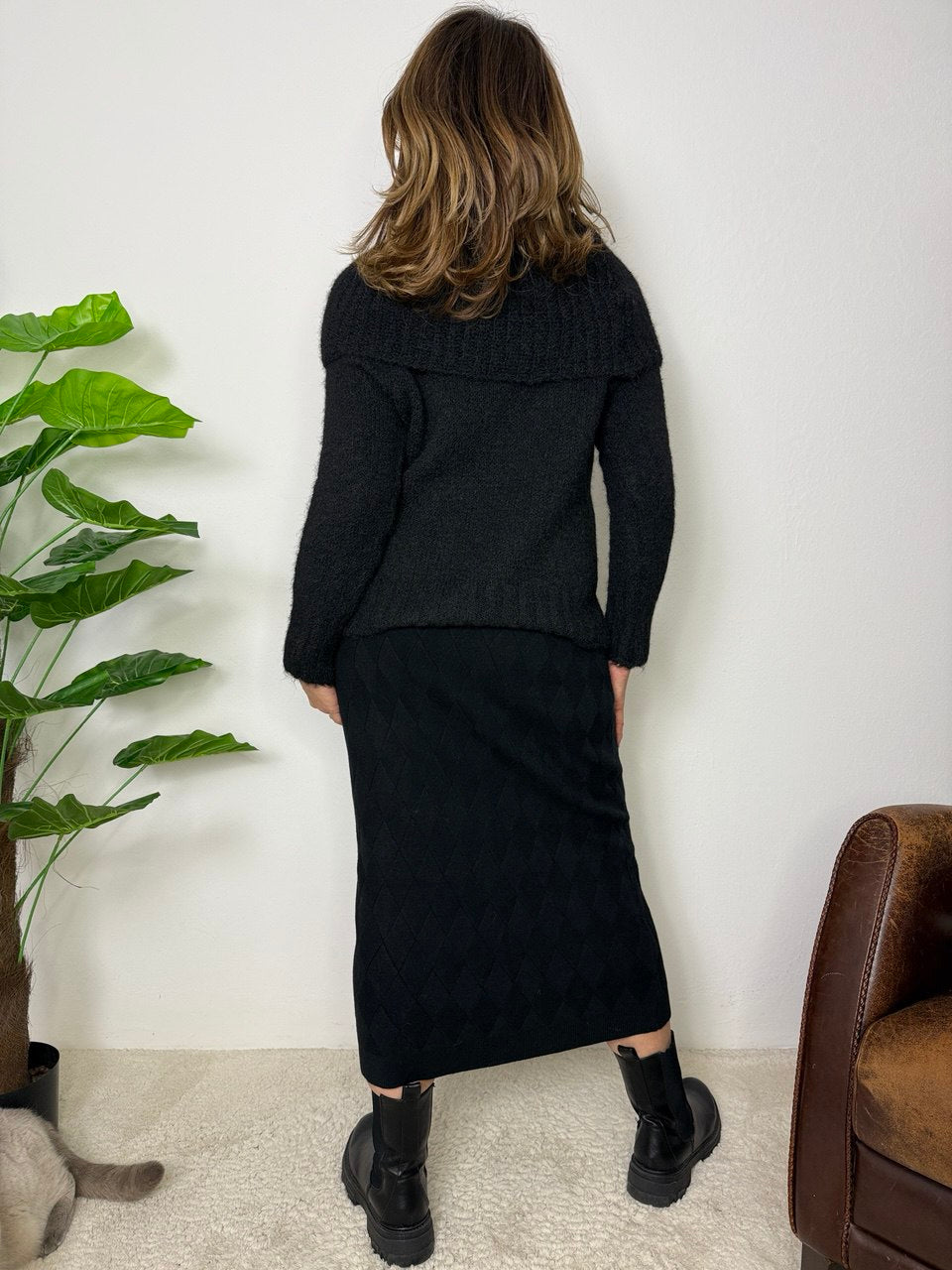 Gonna in tessuto calda viscosa elasticizzato, elastico in vita, lavorazione rombo su tutta la gonna nero su nero, dritto e rovescio di rifinitura sul fondo della gonna, vestibilità dalla taglia 44 alla 48