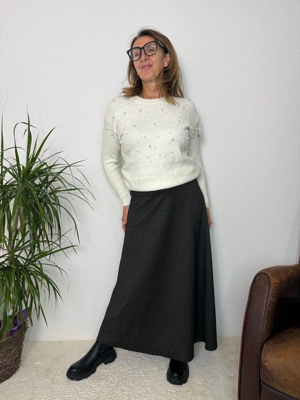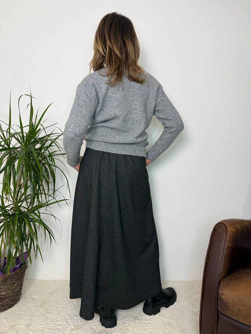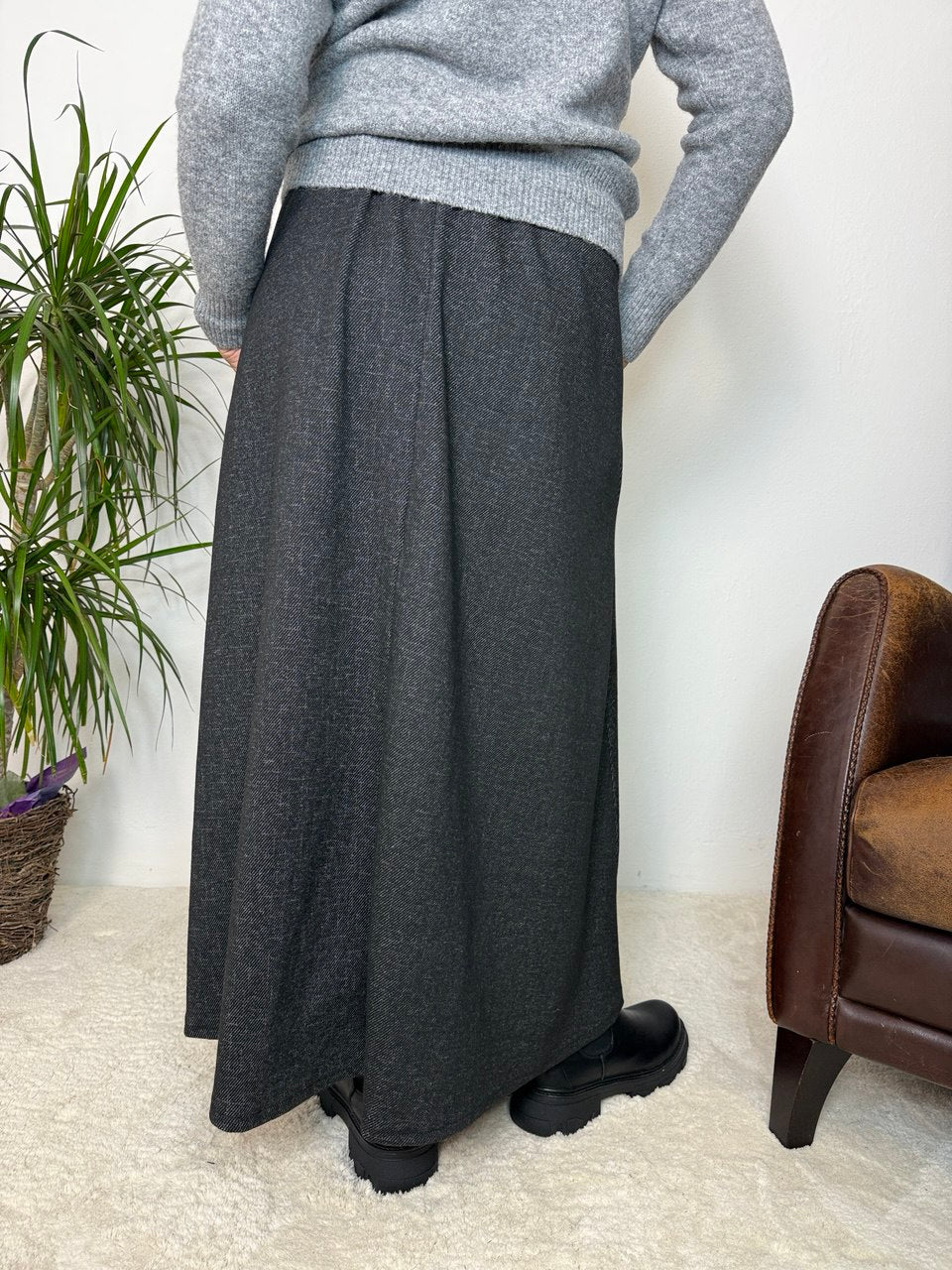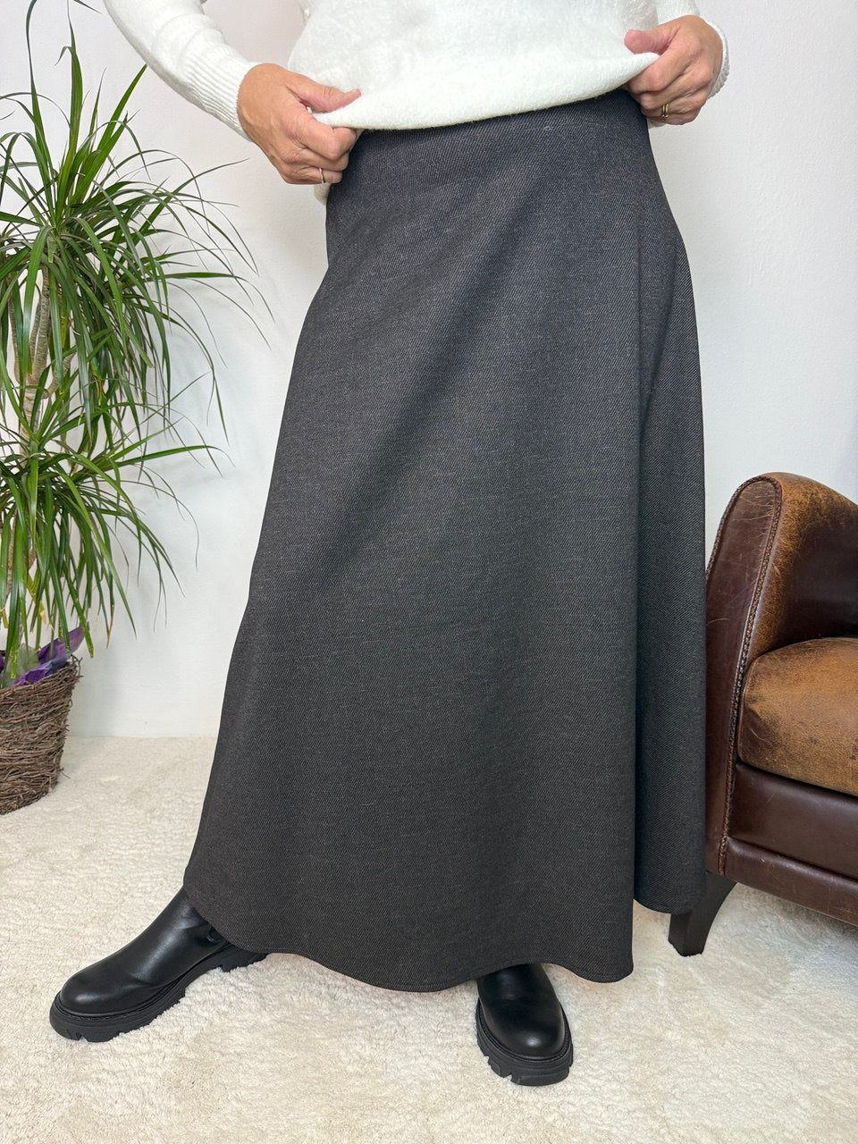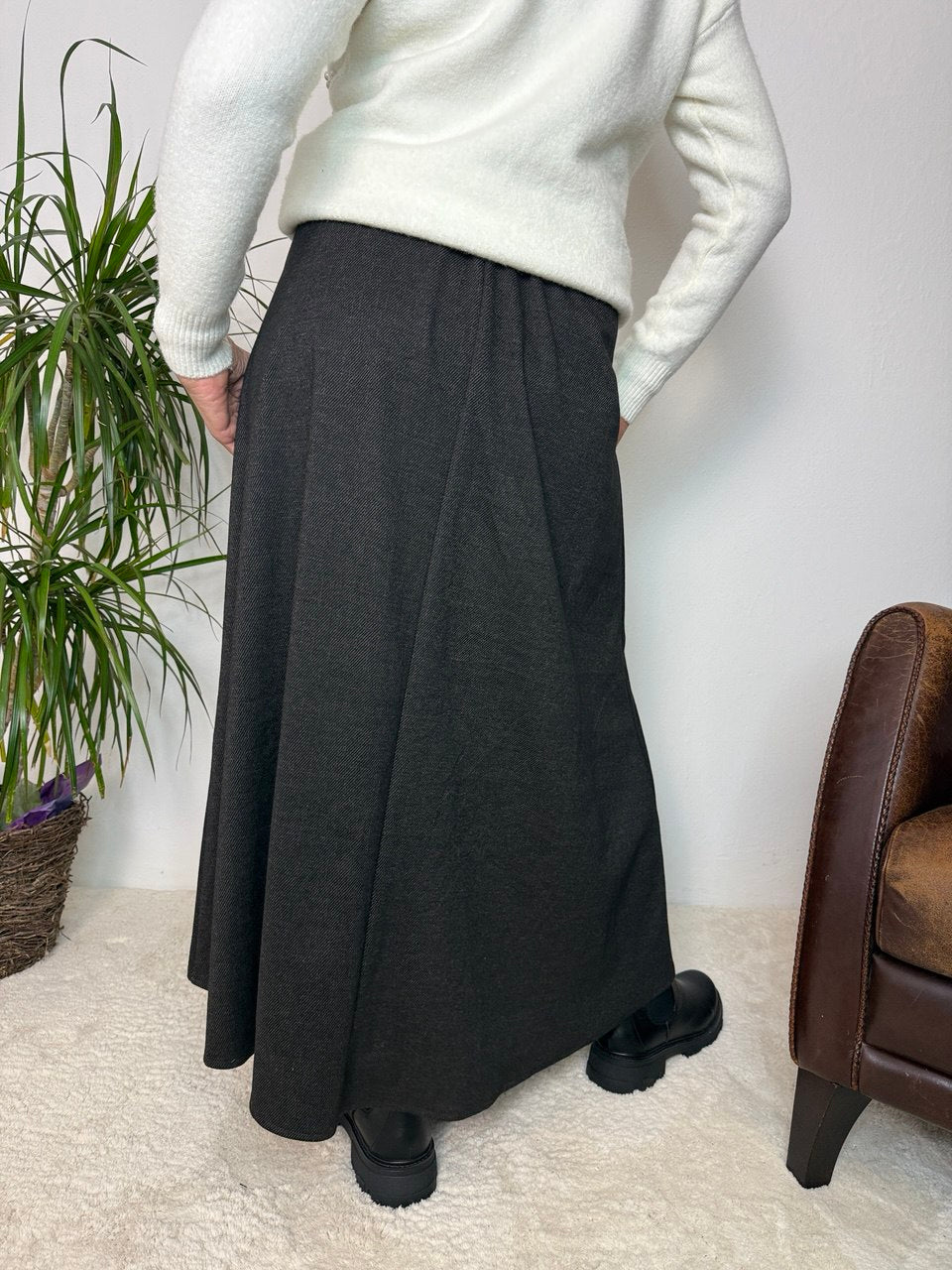 Gonna svasata in tessuto pesante, baschina sul davanti ed elastico sul retro, priva di tasche, vestibilità dalla taglia 44 alla 48