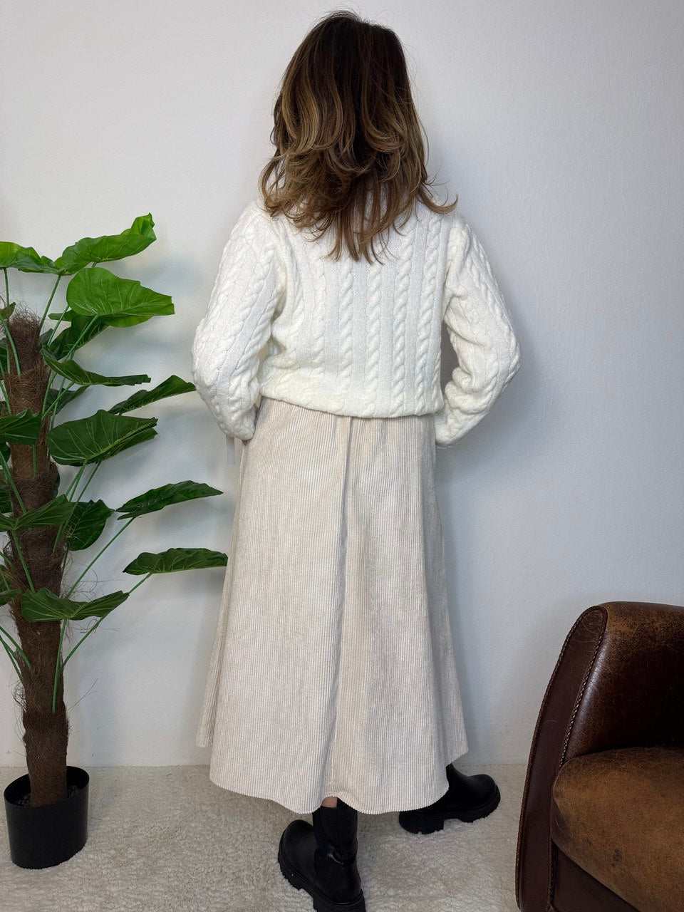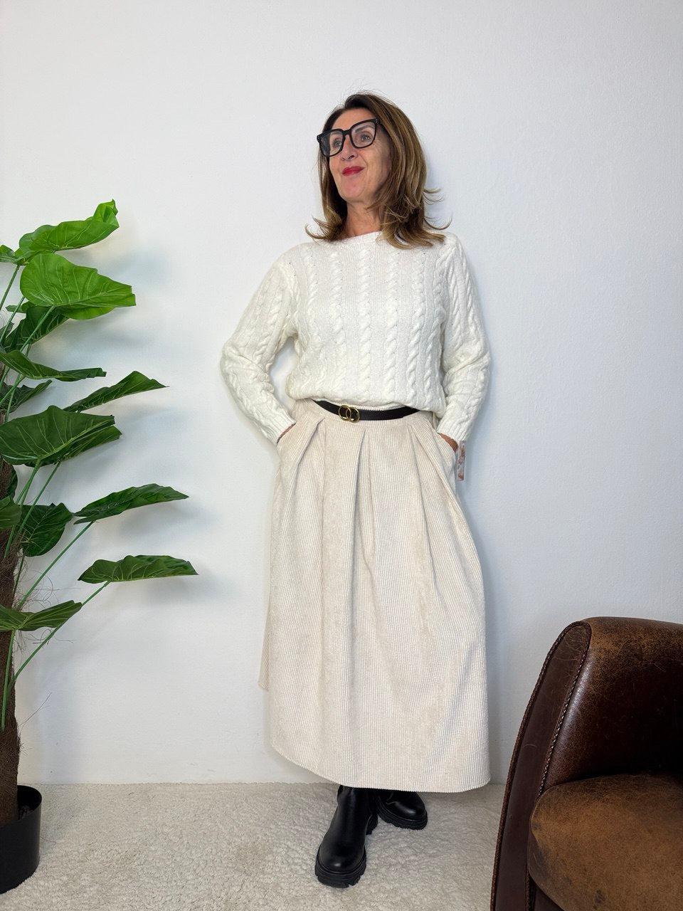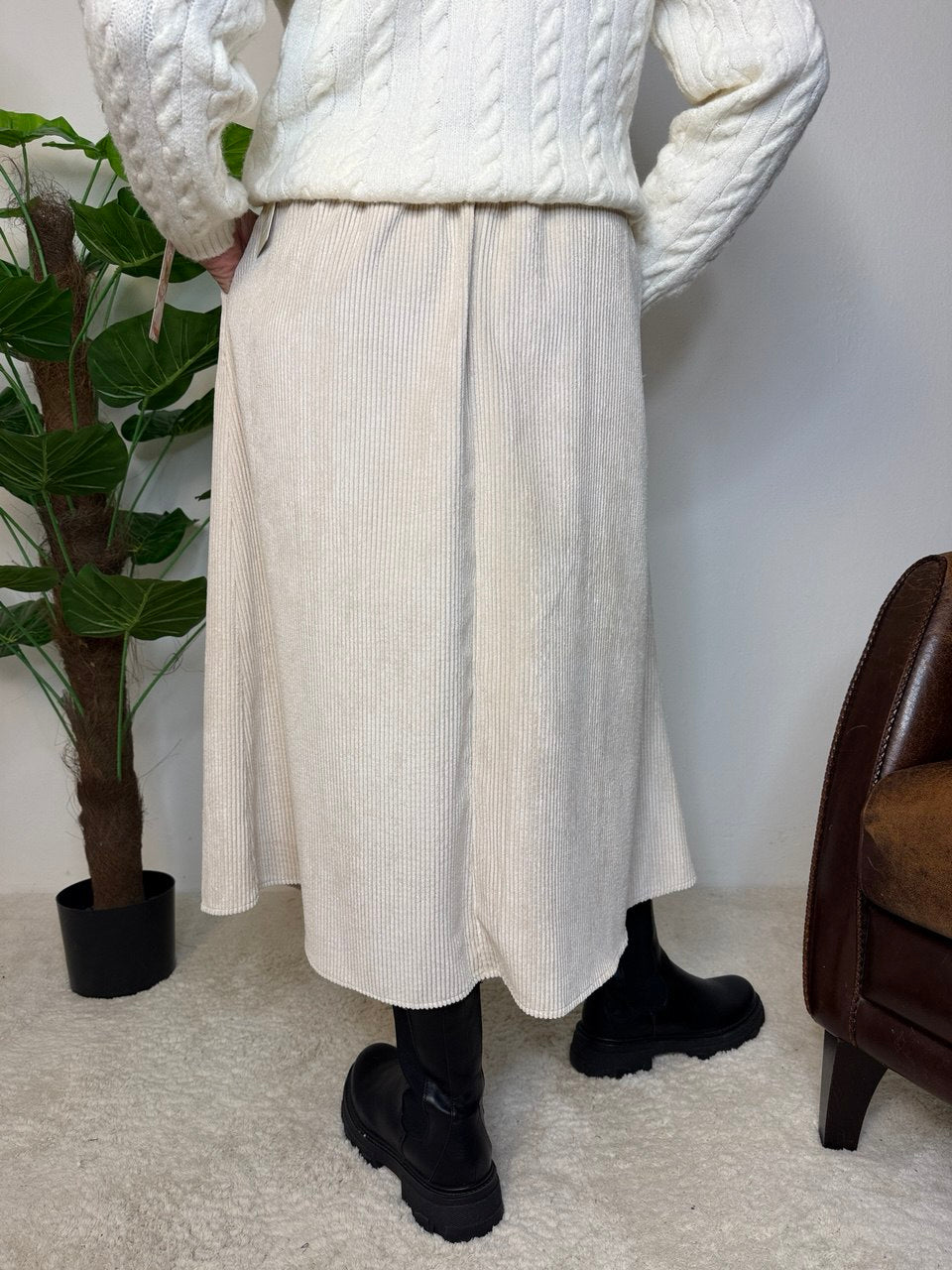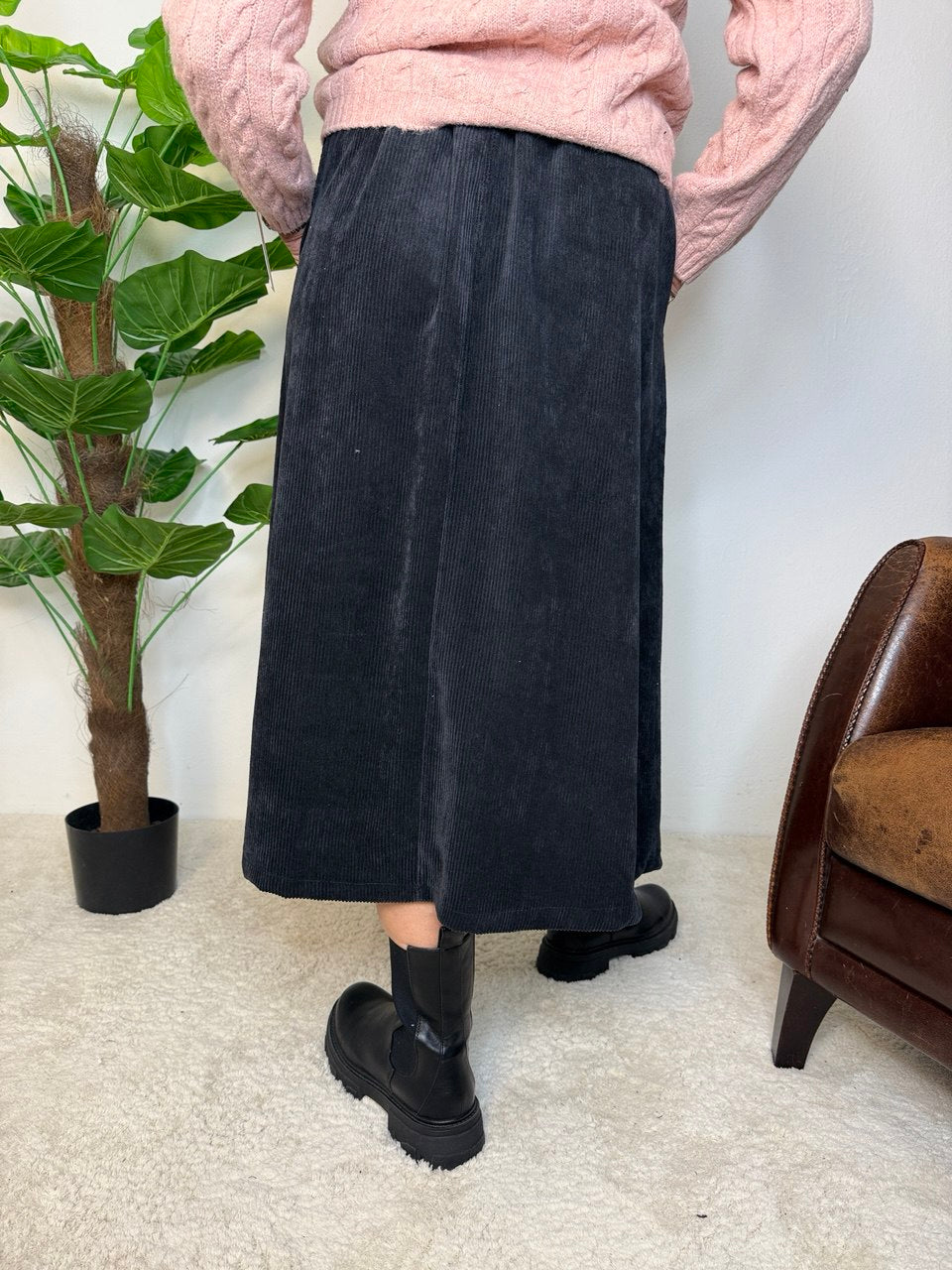 Gonna in velluto con baschina sul davanti ed elastico sul retro, tasche laterali e pence solo sul davanti, vestibilità dalla taglia 44 alla 48