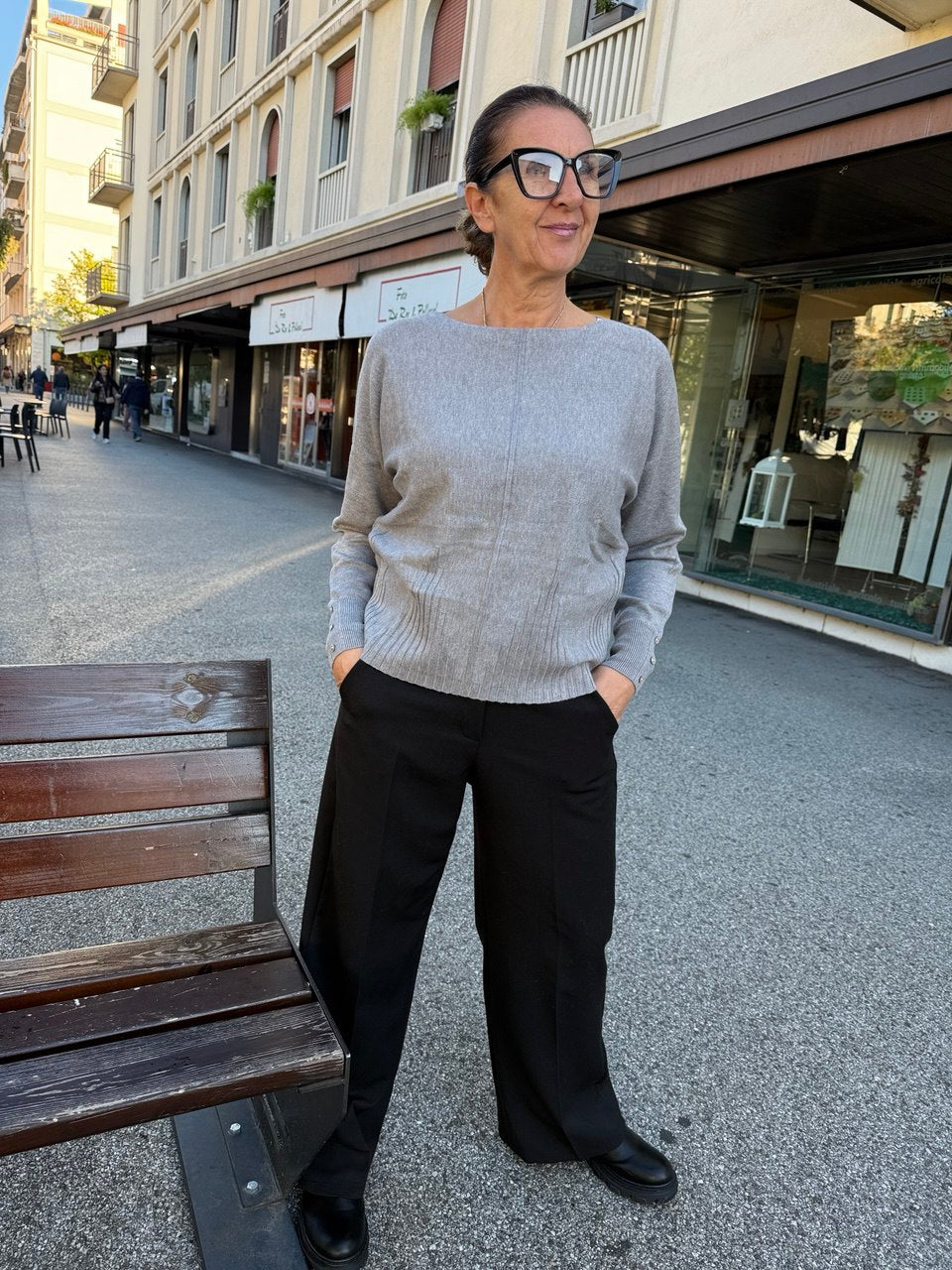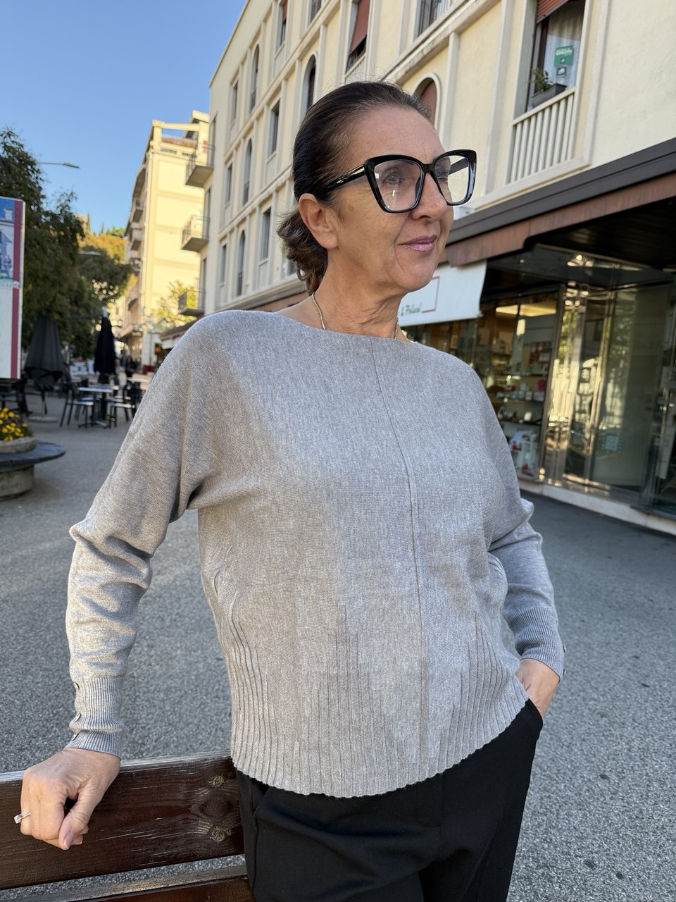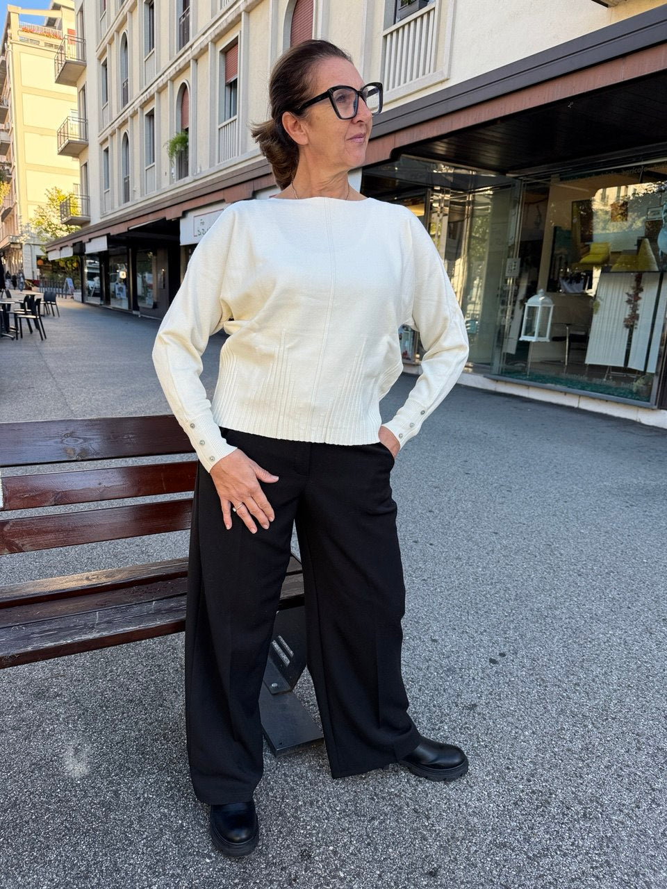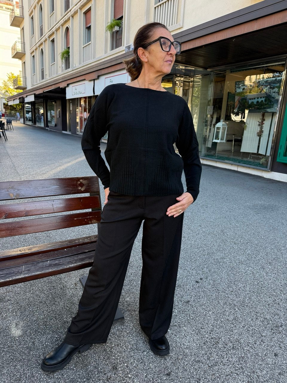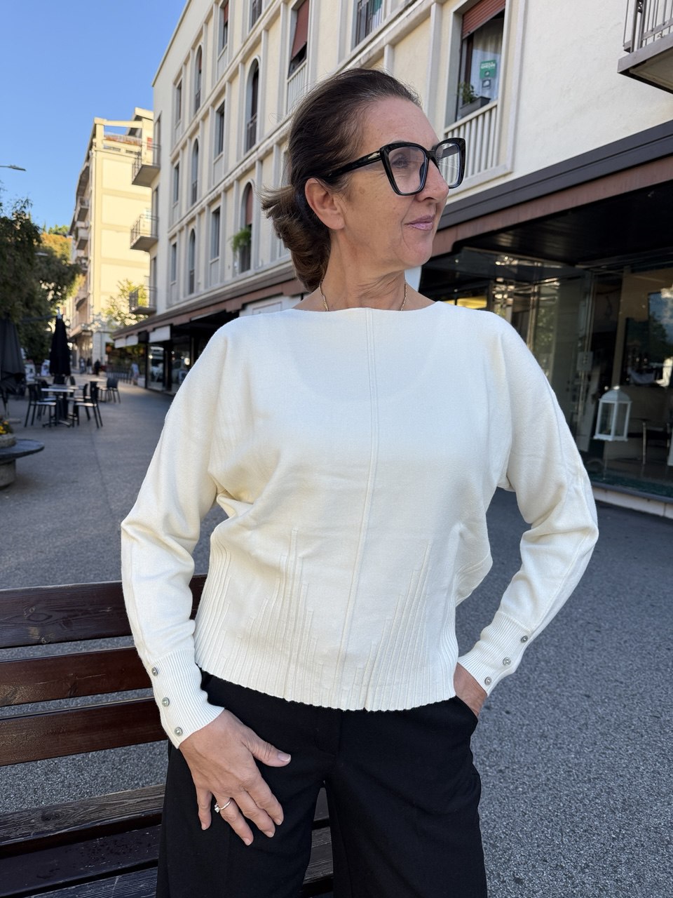 Maglia in tessuto caldo elasticizzato, girocollo ad orlo vivo, manica leggermente a pipistrello, rifinitura sul fondo della maglia, bottoncini di bellezza sul polsino, vestibilità morbida dalla taglia 42 alla 46 leggermente abbondante sul seno