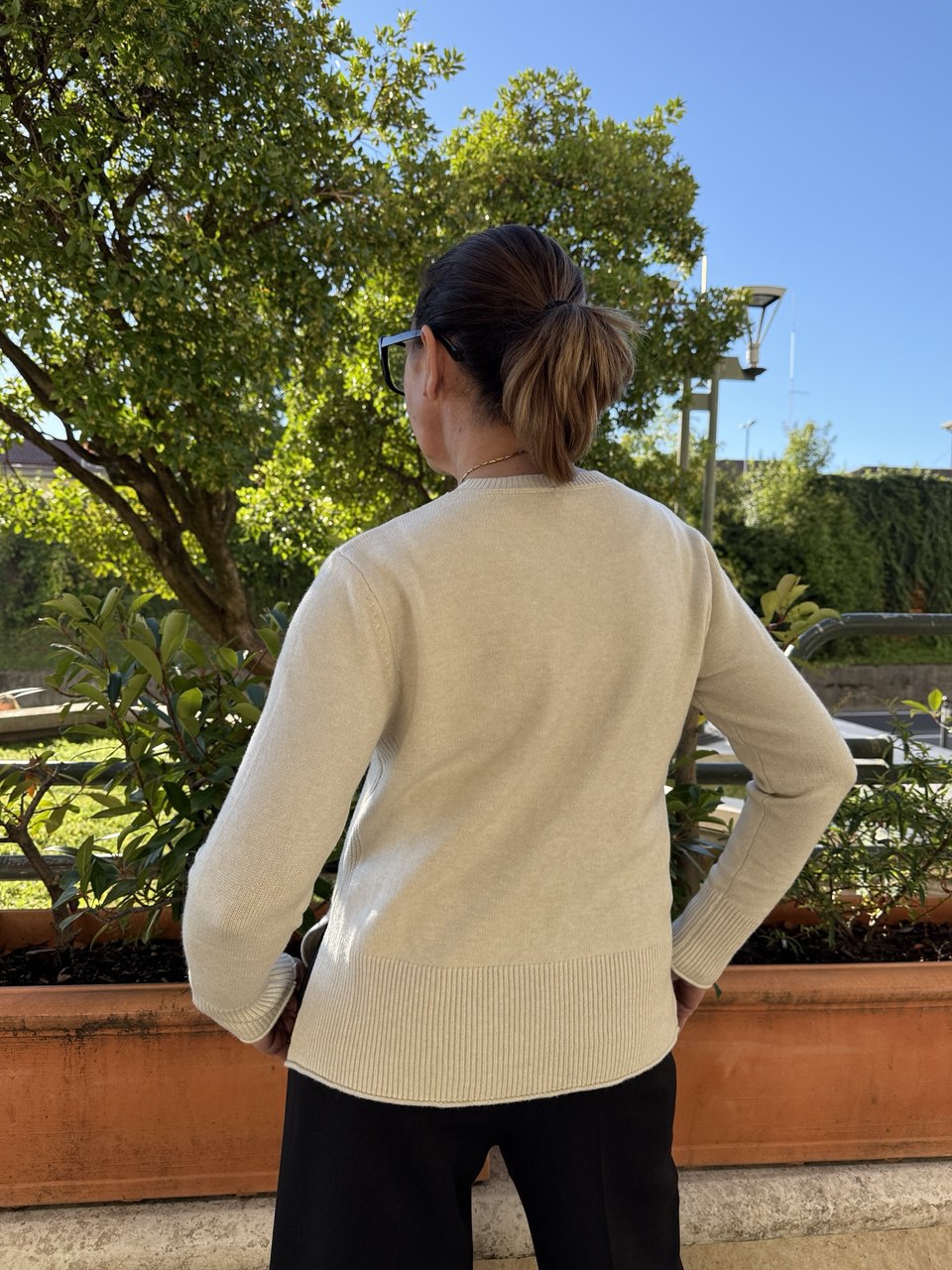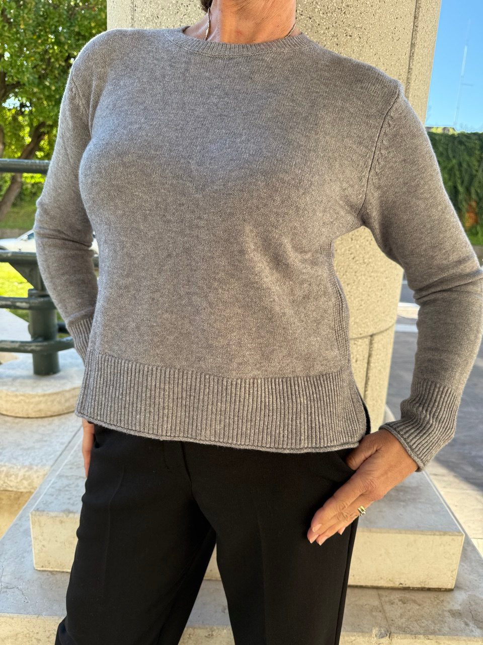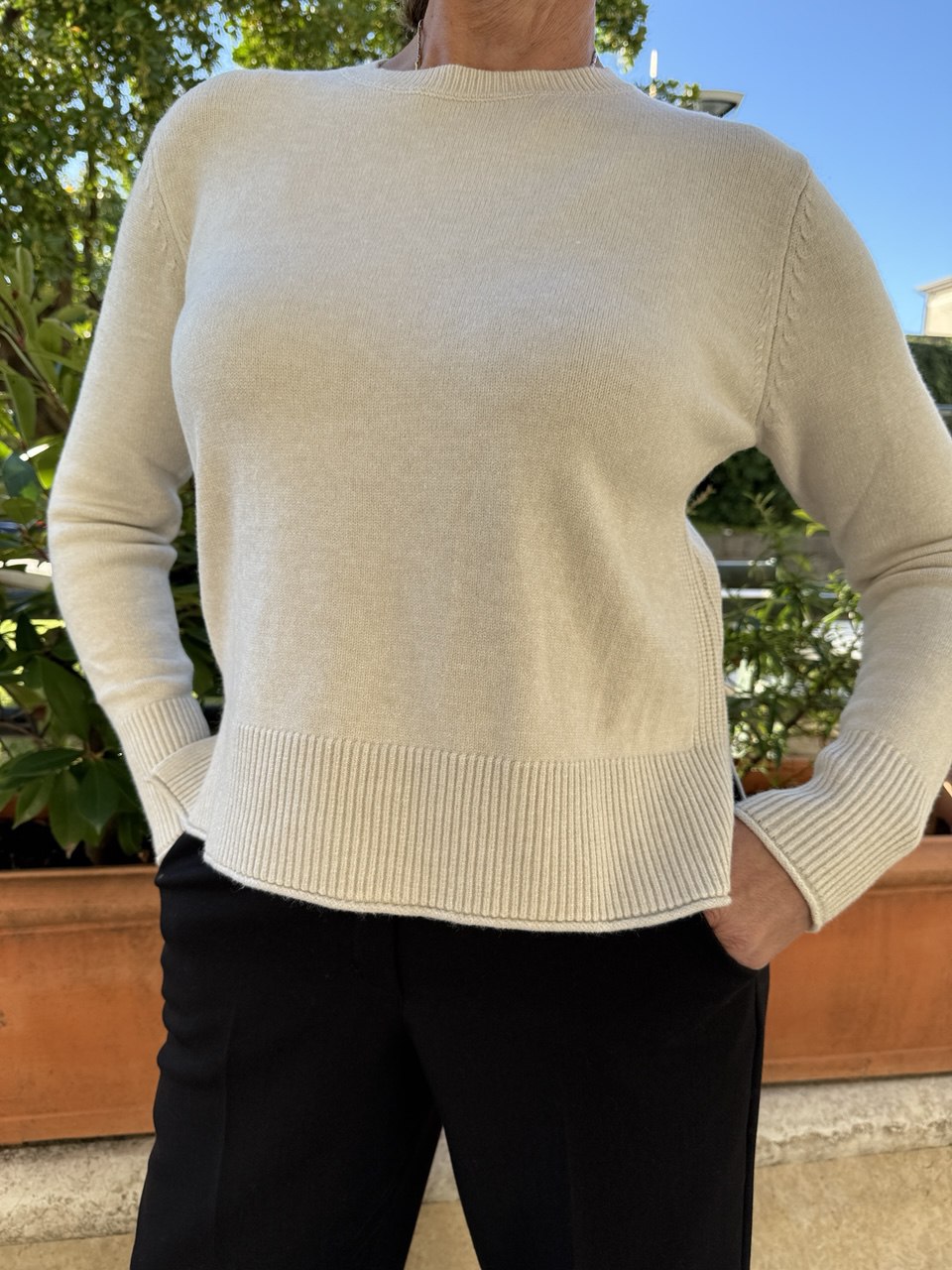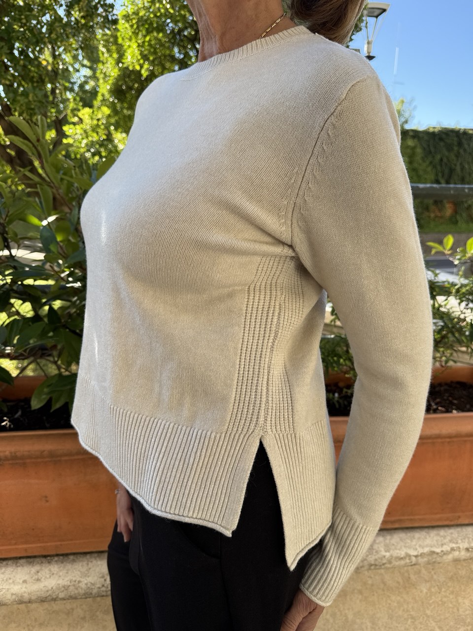 Maglia a girocollo con piccolo bordo a costine, lunghezza primo fianco, leggermente più corta davanti e più lunga dietro, rifinitura a coste sul fondo e spacchi laterali, vestibilità dalla taglia 42 alla 46