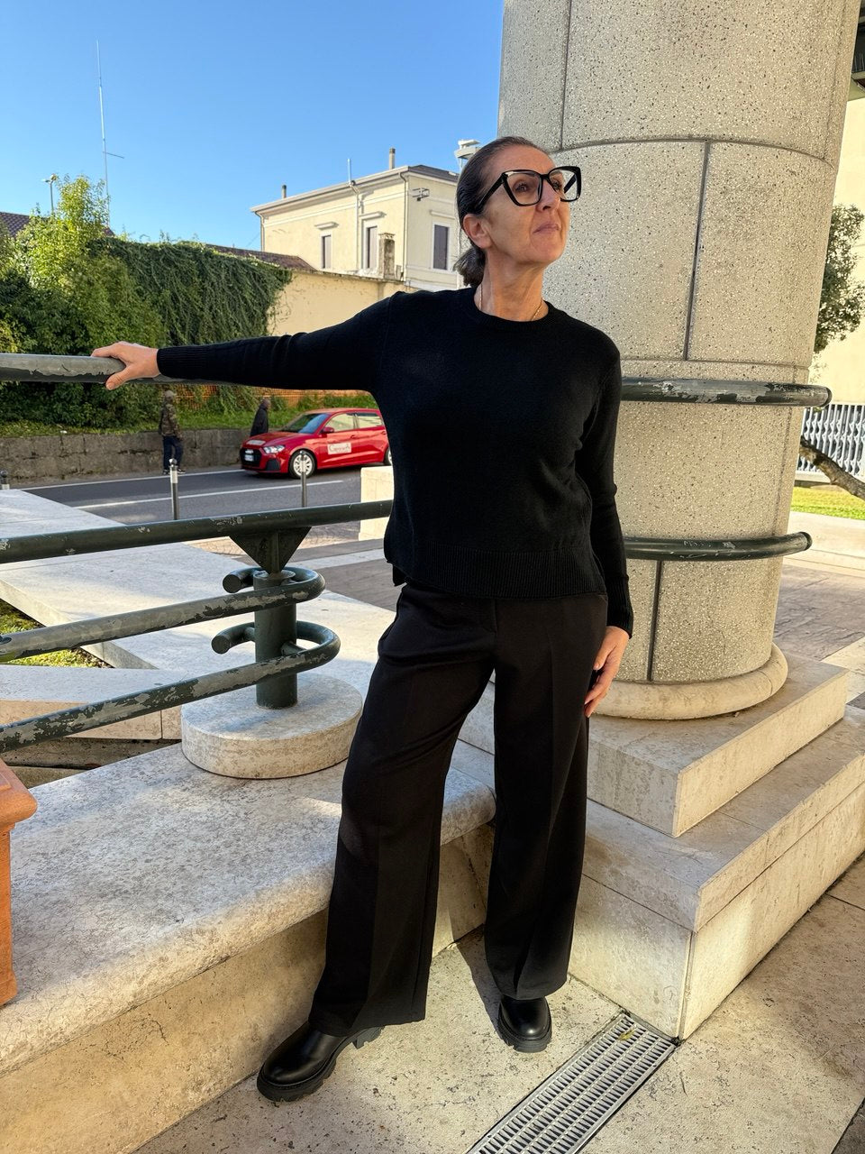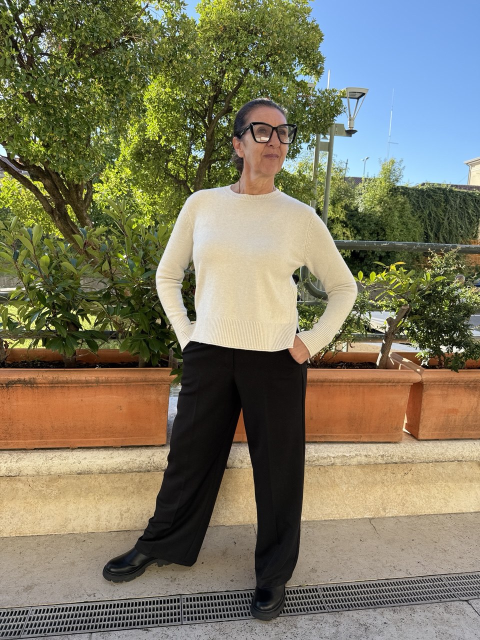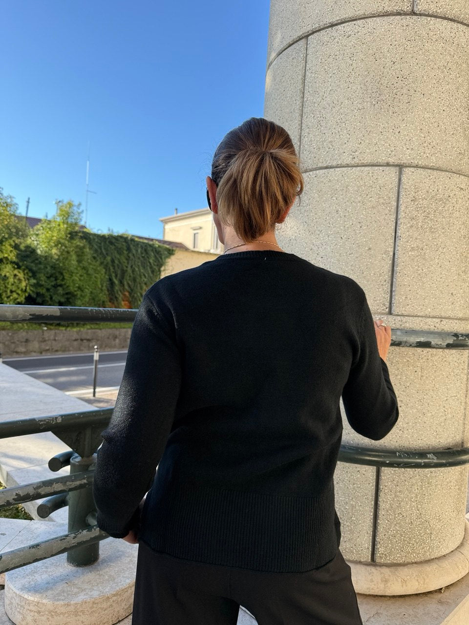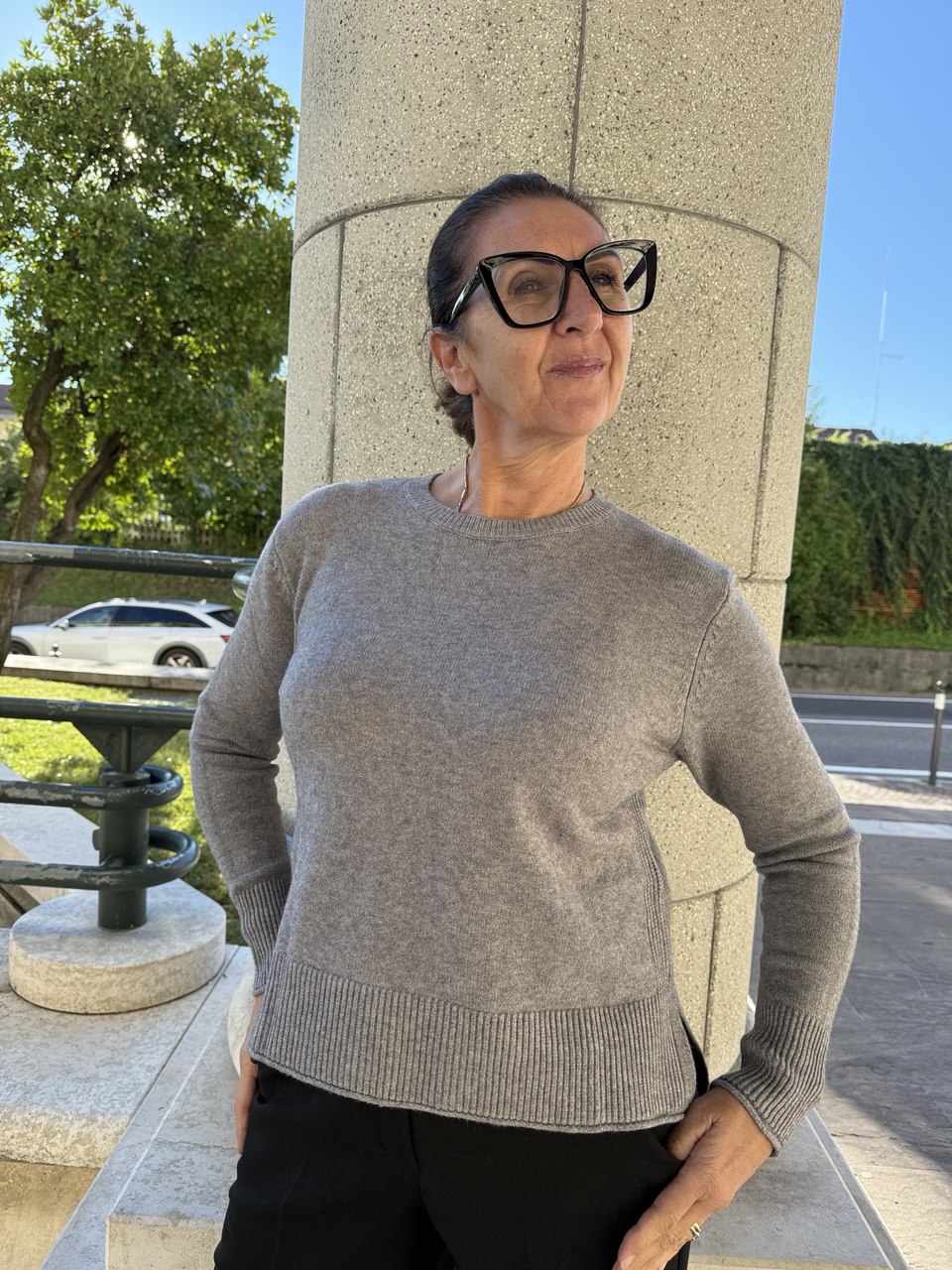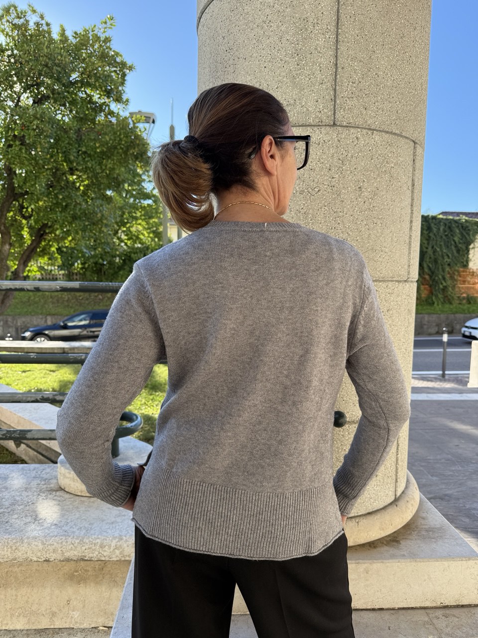 Maglia a girocollo con piccolo bordo a costine, lunghezza primo fianco, leggermente più corta davanti e più lunga dietro, rifinitura a coste sul fondo e spacchi laterali, vestibilità dalla taglia 42 alla 46