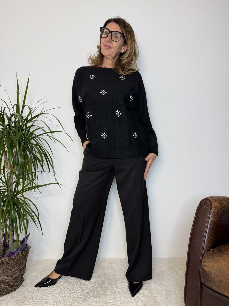 Maglia girocollo ad orlo vivo, manica leggermente a pipistrello, dettaglio perle applicate, vestibilità dalla taglia 46 alla 50
