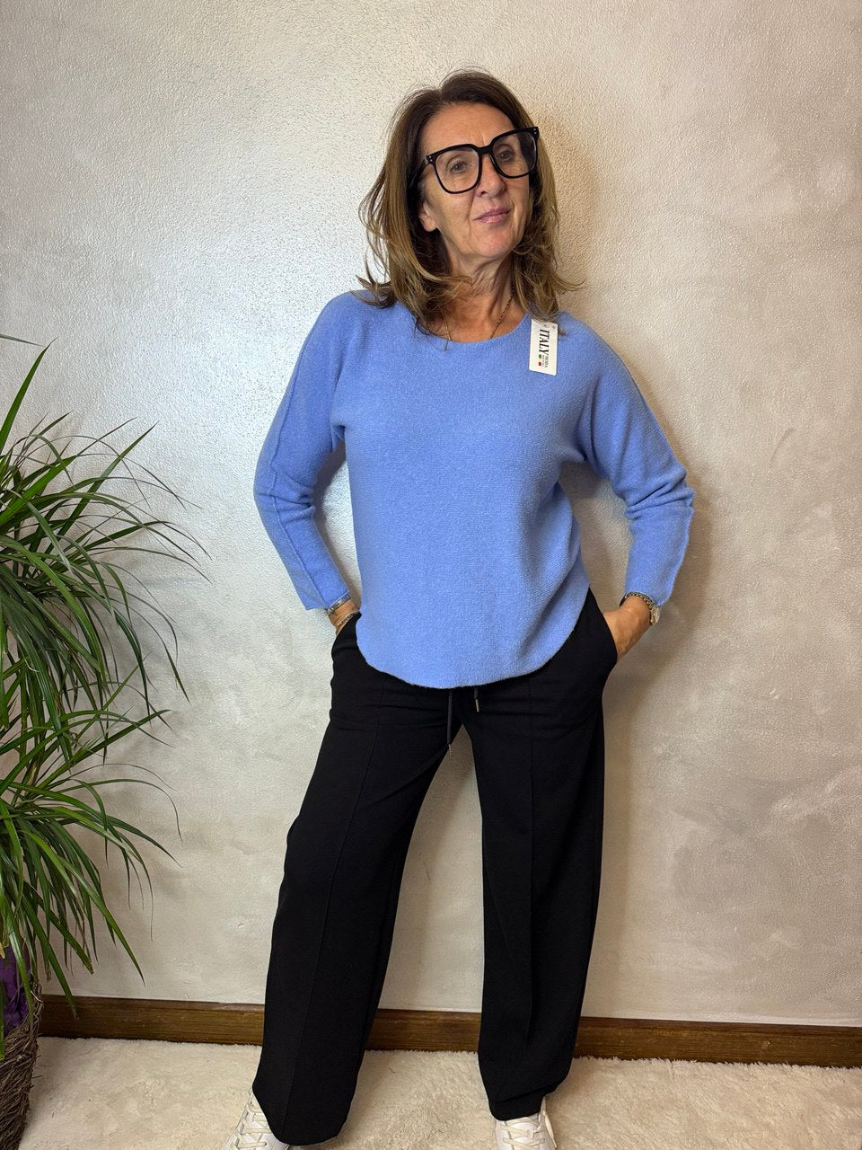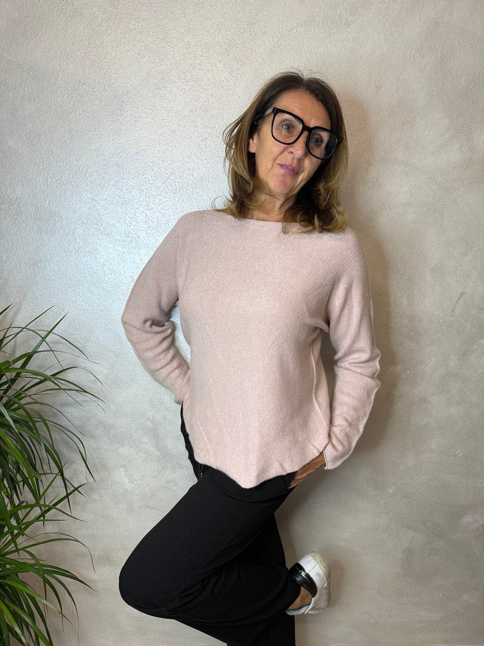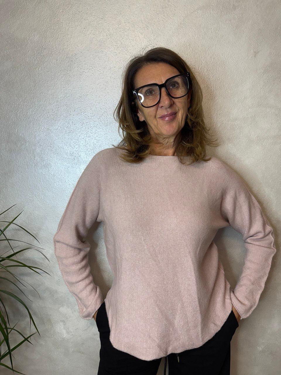 Maglia girocollo in tessuto super soffice, manica che scende, dettagli girocollo, manica e fondo della maglia leggermente arrotolato, vestibilità morbida dalla taglia 42 alla 46