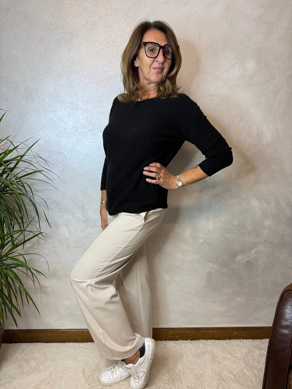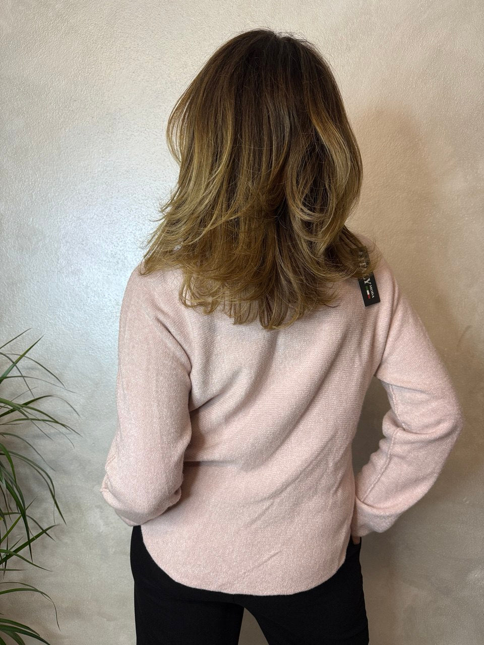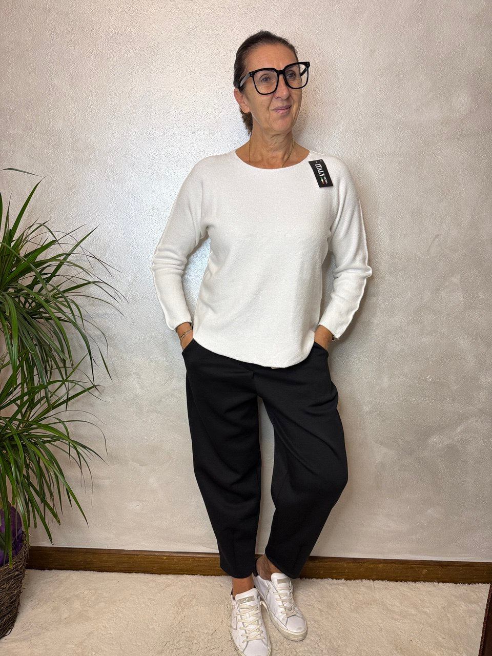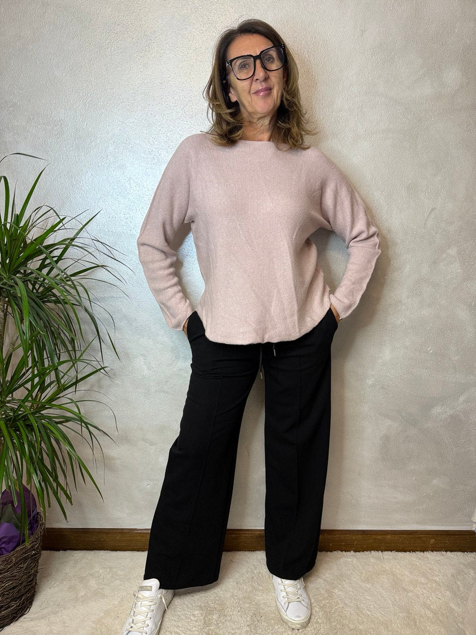 Maglia girocollo in tessuto super soffice, manica che scende, dettagli girocollo, manica e fondo della maglia leggermente arrotolato, vestibilità morbida dalla taglia 42 alla 46
