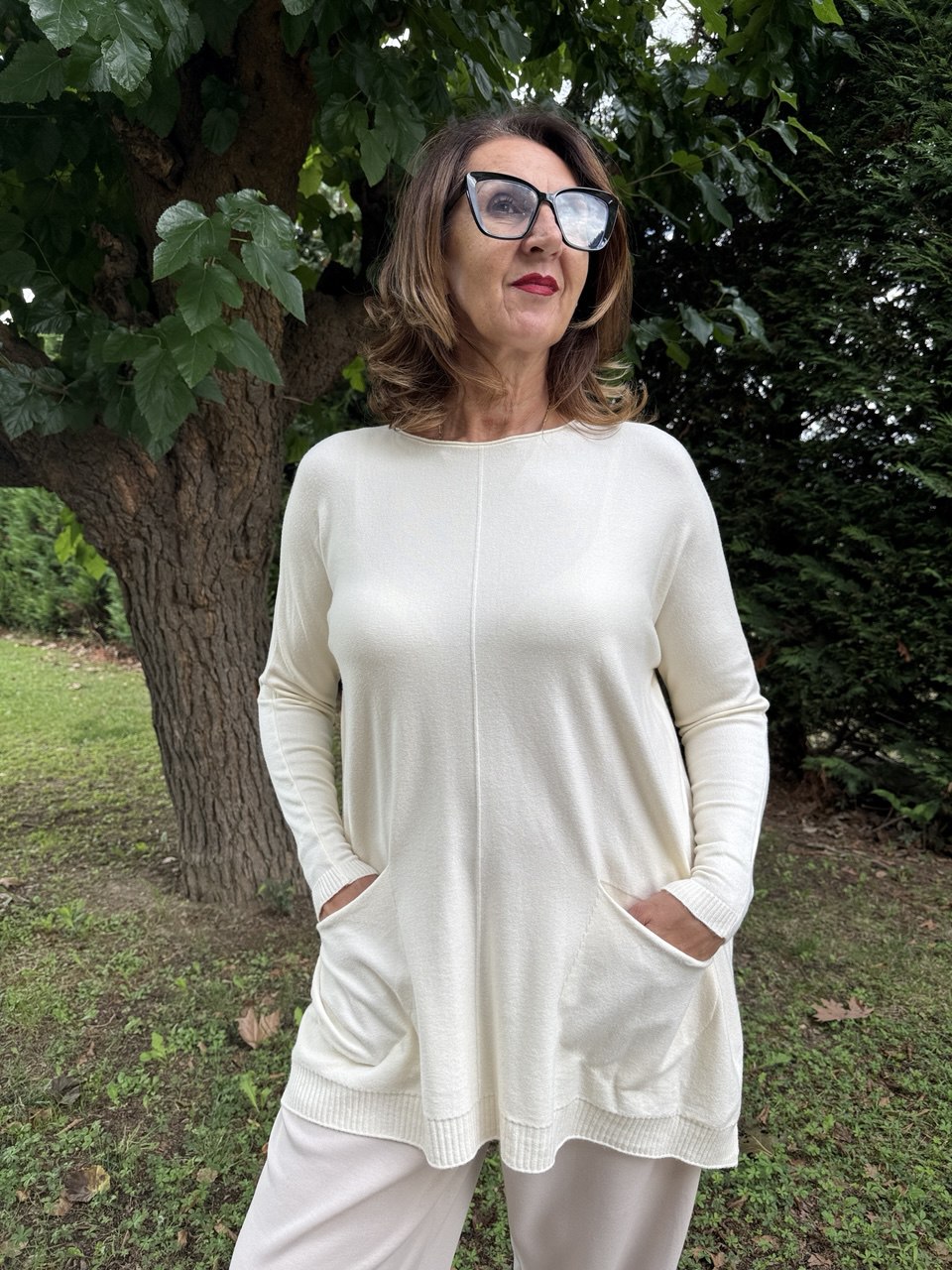 Maglia girocollo, con bordo di rifinitura al centro della maglia sia anteriormente che posteriormente, tasche, vestibilità morbida