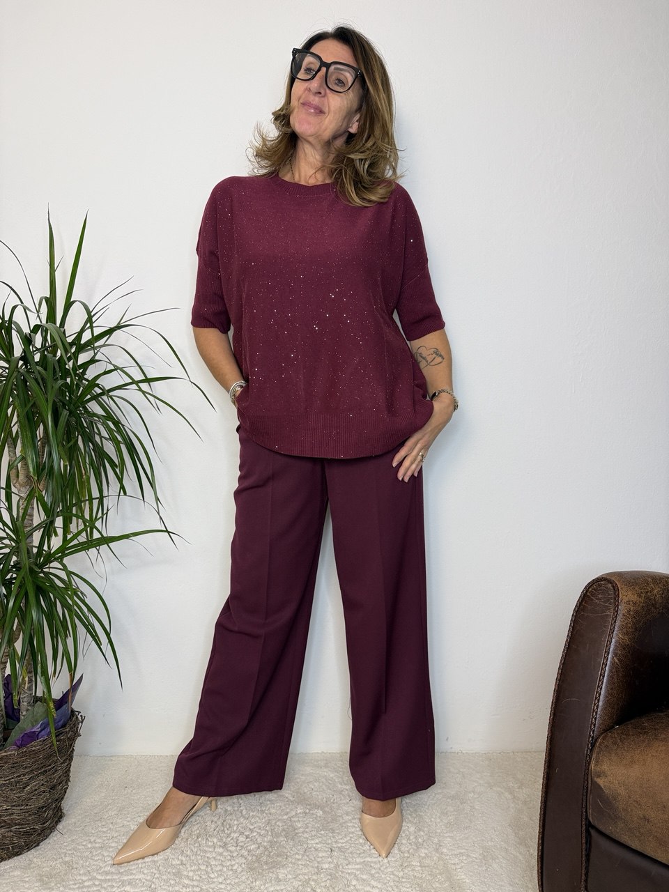 Maglia in tessuto pettinato a girocollo, spalla che scende e manicotto a coste corto, abbellita da micro paillettes sia davanti che dietro, vestibilità oversize dalla taglia 46 alla 52/54