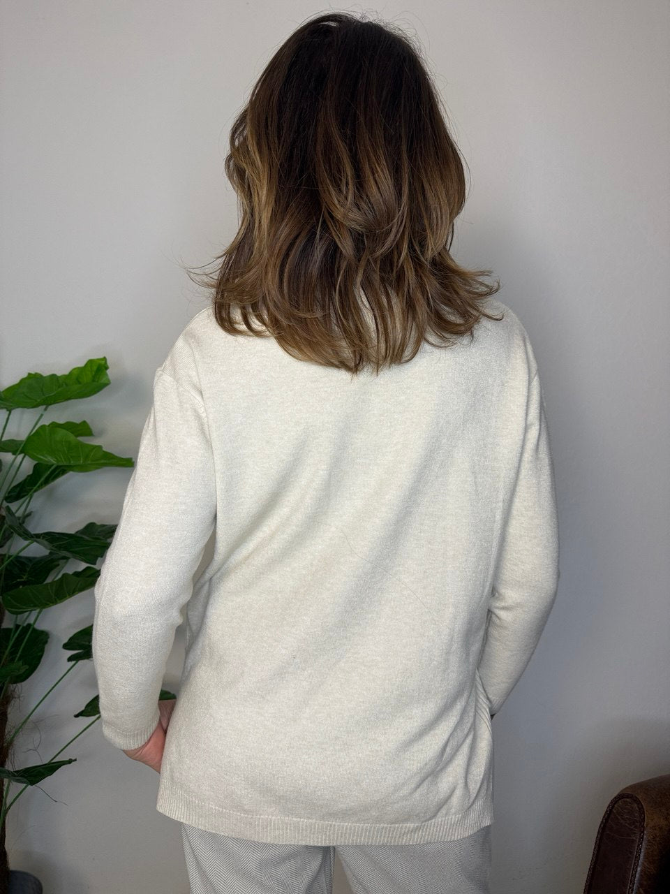Maglia girocollo in tessuto calda viscosa elasticizzata, due tasche sul davanti, due spacchi laterali, leggermente più corta davanti e più lunga dietro, vestibilità dalla taglia 46 alla 50