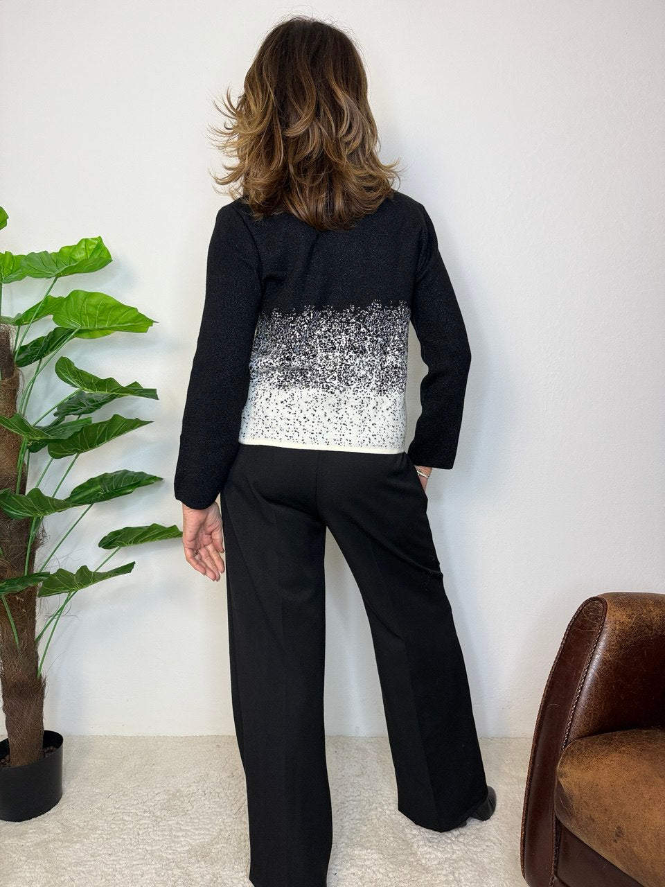 Maglia a girocollo con taglio a scatoletta, sfumata dal colore nero al bianco, leggermente luccicosa nella parte superiore, vestibilità dalla taglia 42 alla 46