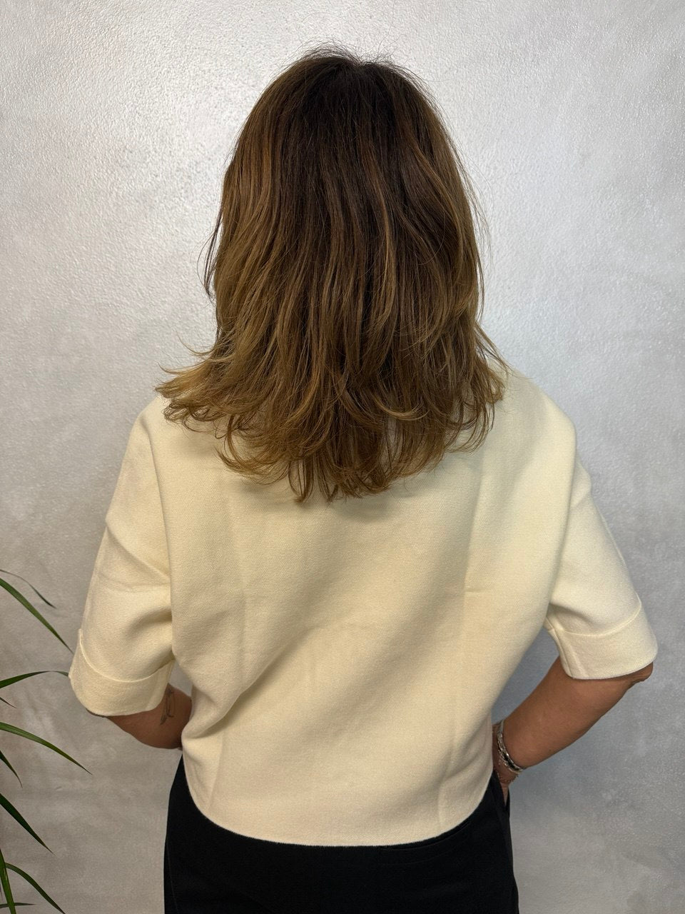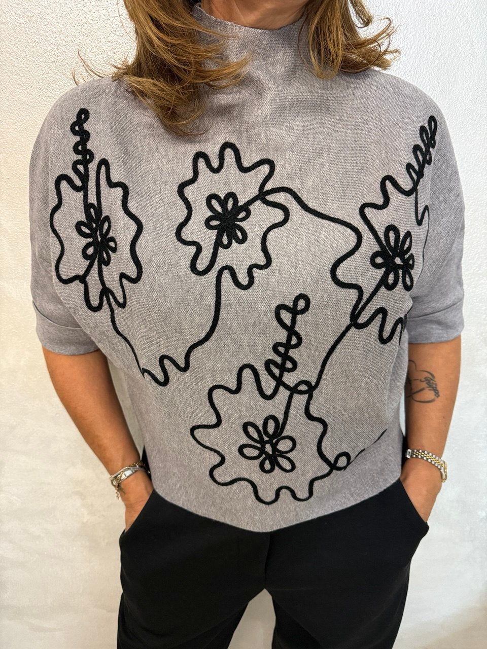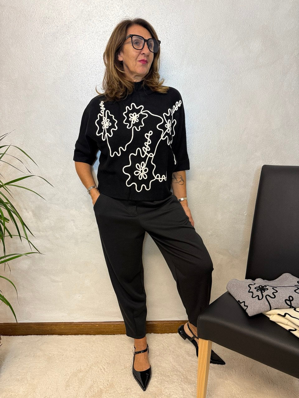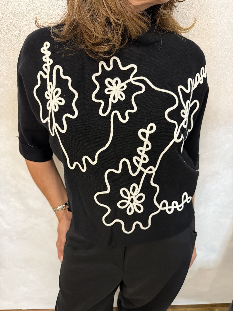 Maglia in tessuto elasticizzato, collo a vulcano, manica dal gomito con risvolto, misura primo fianco, ricamata sul davanti, liscia sul retro