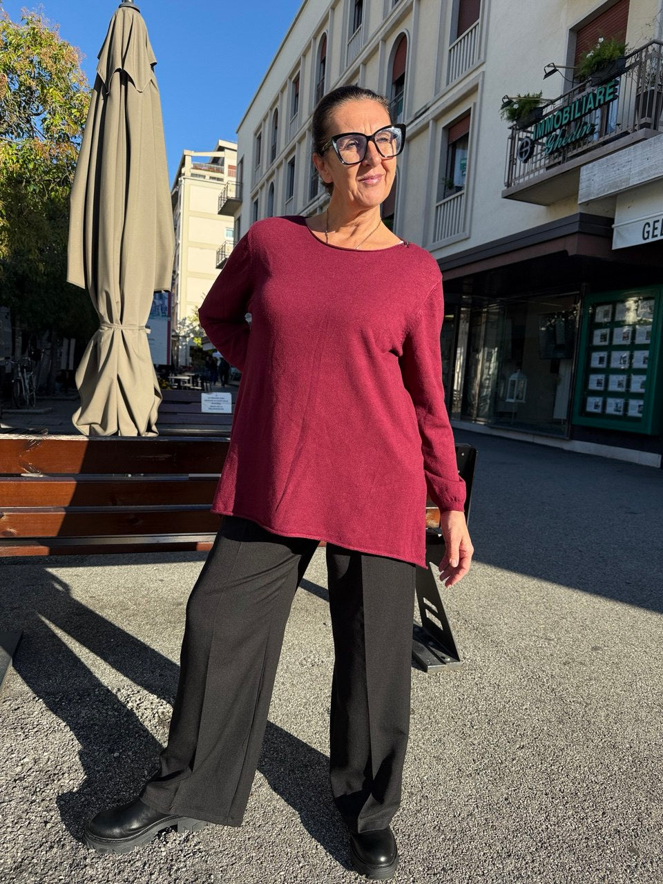 Maglia svasata girocollo ad orlo vivo, due spacchi molto grandi a lato, vestibilità morbida dalla taglia 44 alla 48