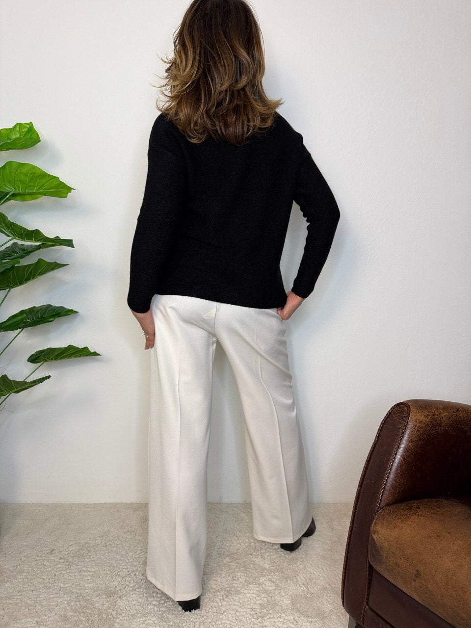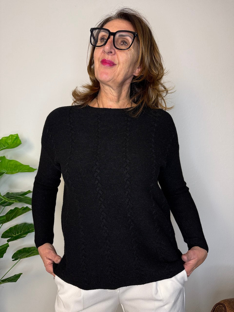 Maglione girocollo in tessuto misto viscosa elasticizzata, giro manica che scende leggermente, lavorazione solo sul davanti, vestibilità dalla taglia 44 alla 48