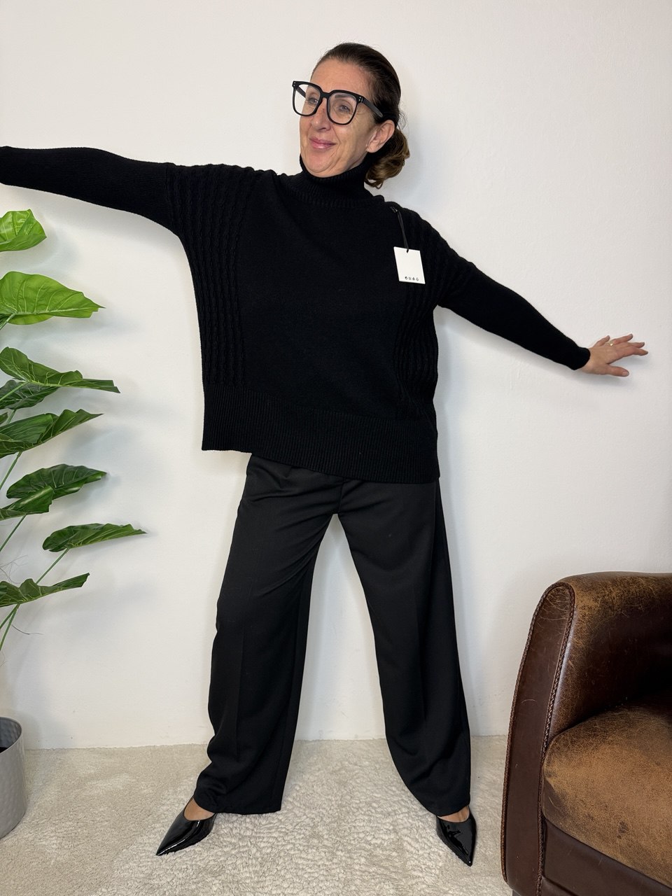 Maglione dolcevita in tessuto calda viscosa elasticizzata, spalla che scende e manicotto alto, treccine di lavorazione solo sul fronte ai lati, abbassamento a coste sul fondo della maglia di 14cm, vestibilità oversize dalla taglia 48 alla 52