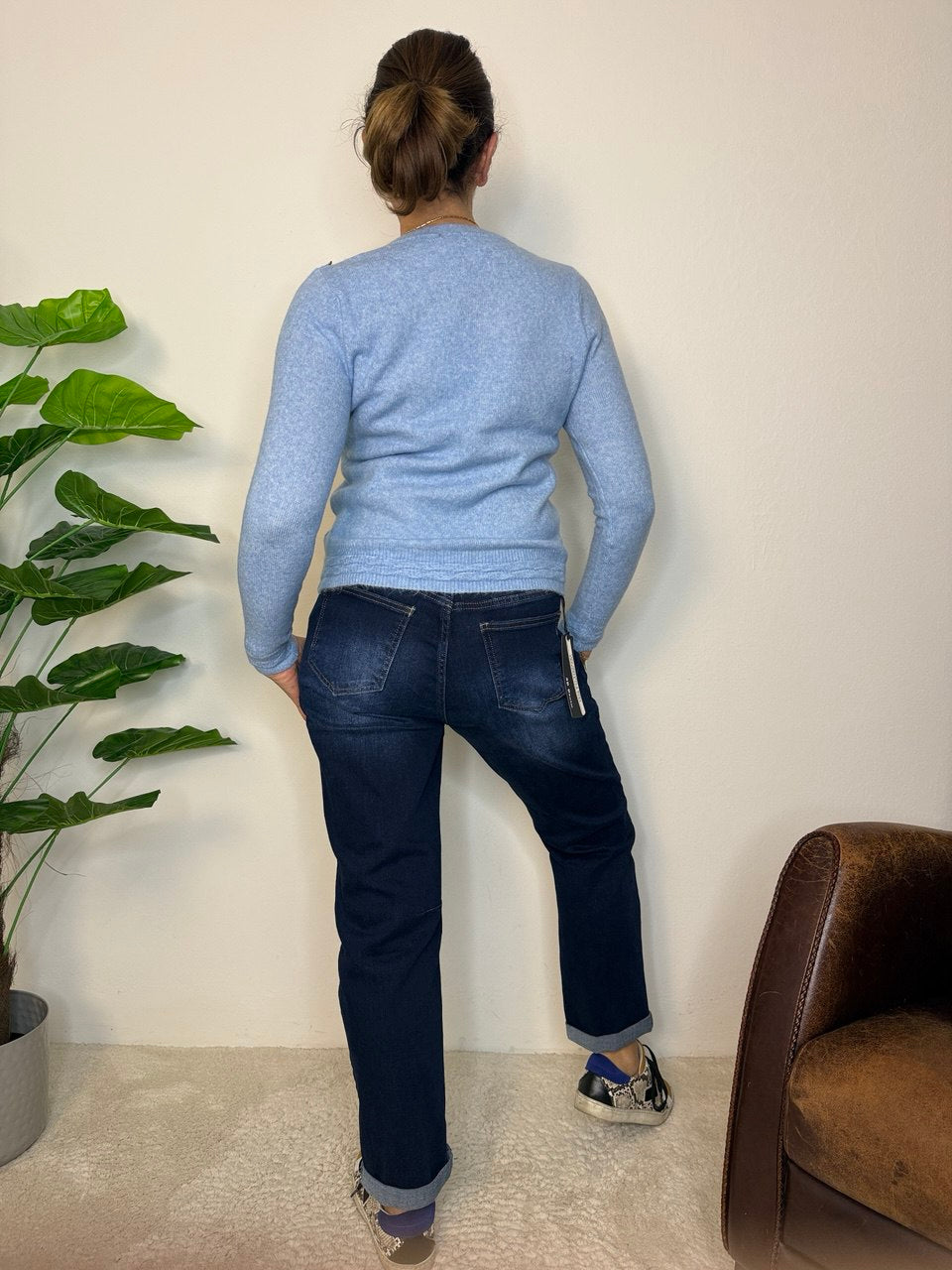 Maglione girocollo in tessuto misto lana con greca sul polsino e sul fondo della maglia, bottoncini di bellezza sulla spalla sinistra, vestibilità slim dalla taglia 42 alla 46