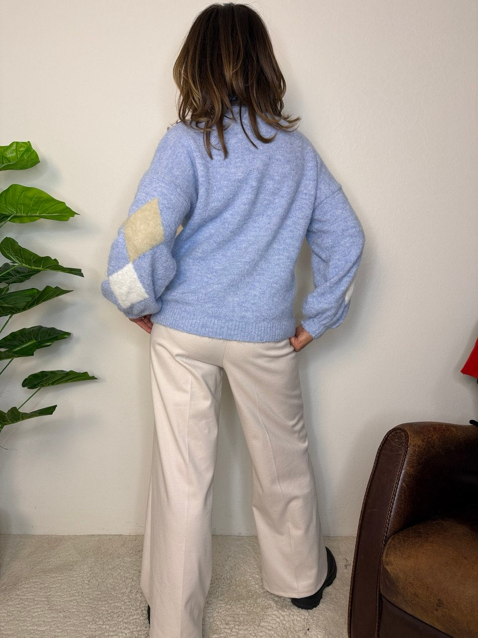 Maglione in tessuto misto lana elasticizzato con collo a vulcano, giro manica che scende e manica a palloncino, abbellito da lavorazione rombi sul davanti e sulle maniche, vestibilità leggermente morbida dalla taglia 44 alla 48