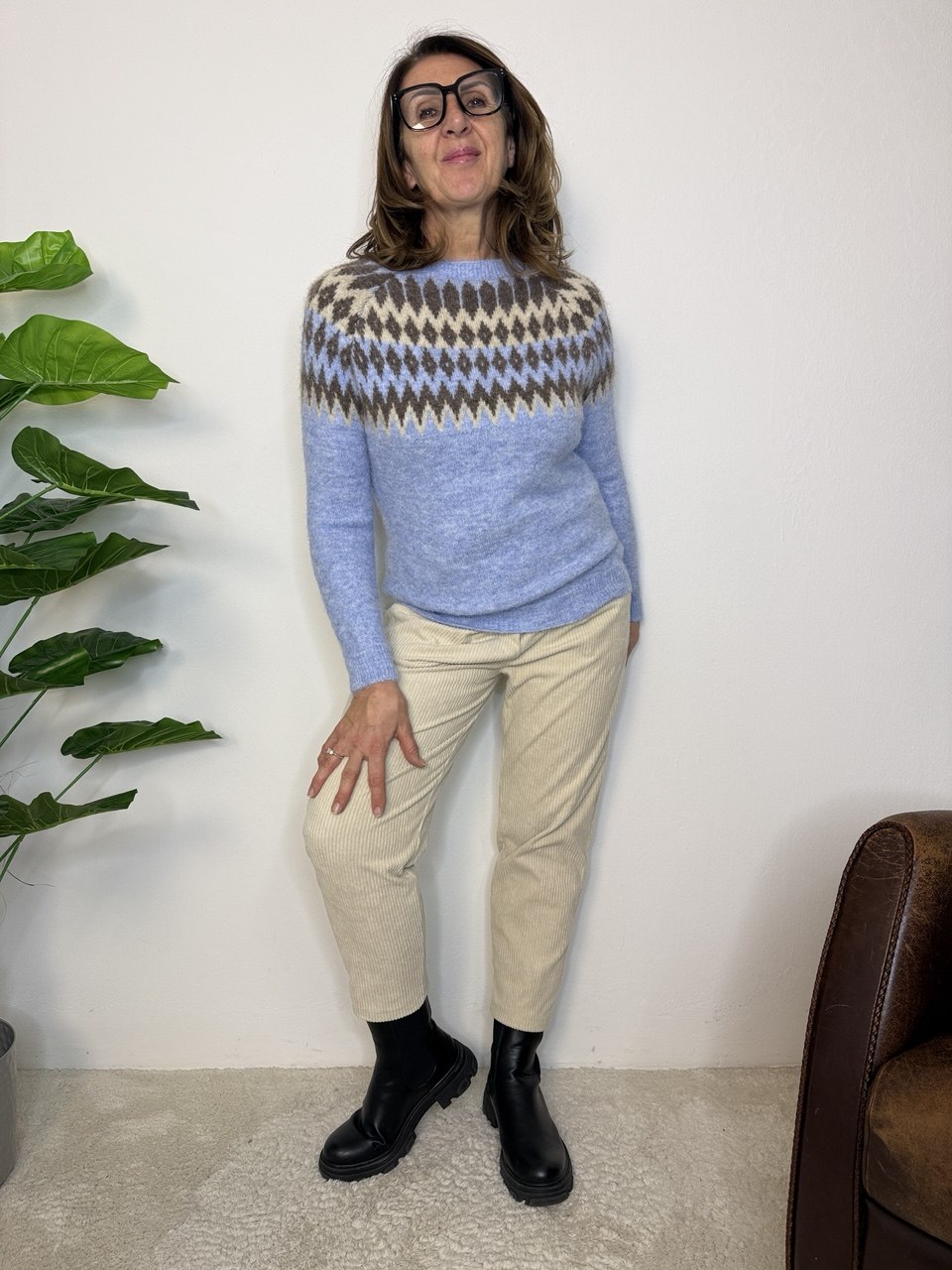Maglione girocollo in tessuto misto lana, manica a raglan, dettaglio greca nella parte alta, tessuto elasticizzato e caldo, vestibilità dalla taglia 42 alla 46