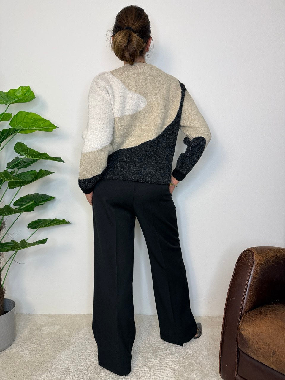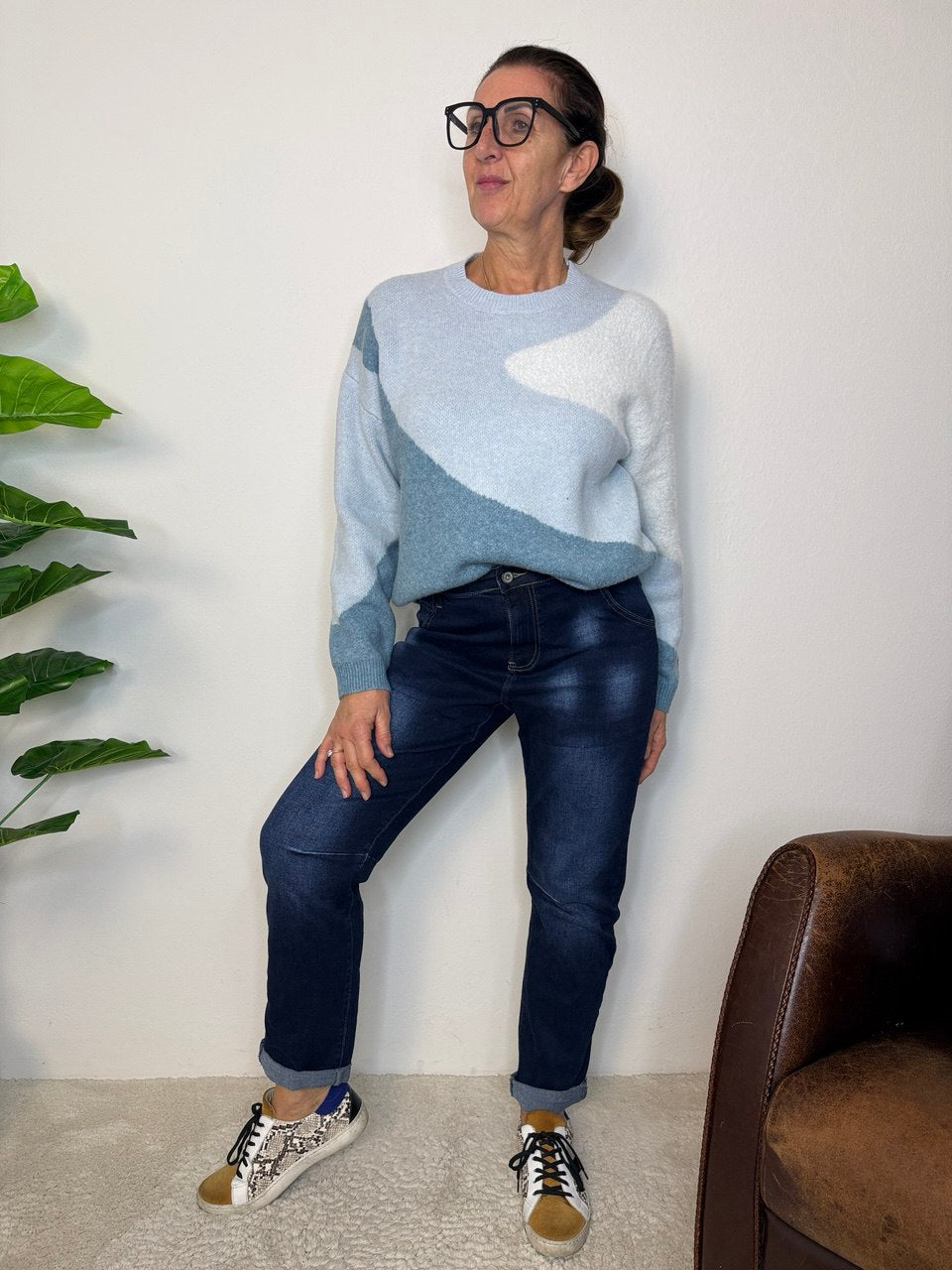 Maglione in tessuto misto lana a girocollo, giro manica che scende leggermente, molto d'effetto, tessuto consistente, soffice ed elasticizzato, vestibilità dalla taglia 44 alla 48