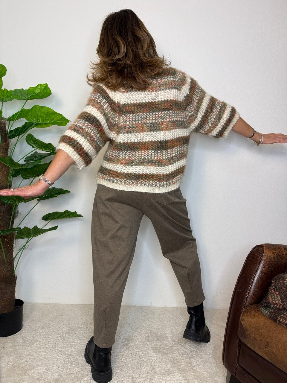 Maglione ad effetto pelosetto (non perde pelo) con collo a vulcano che si arrotola leggermente, manica 3/4 raglan larga, vestibilità dalla taglia 46 alla 50