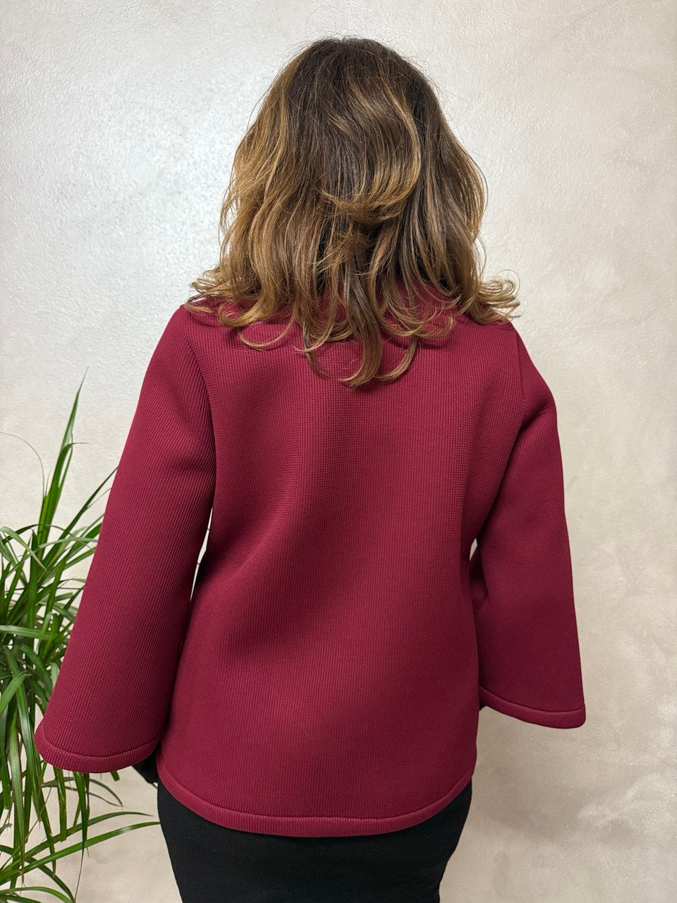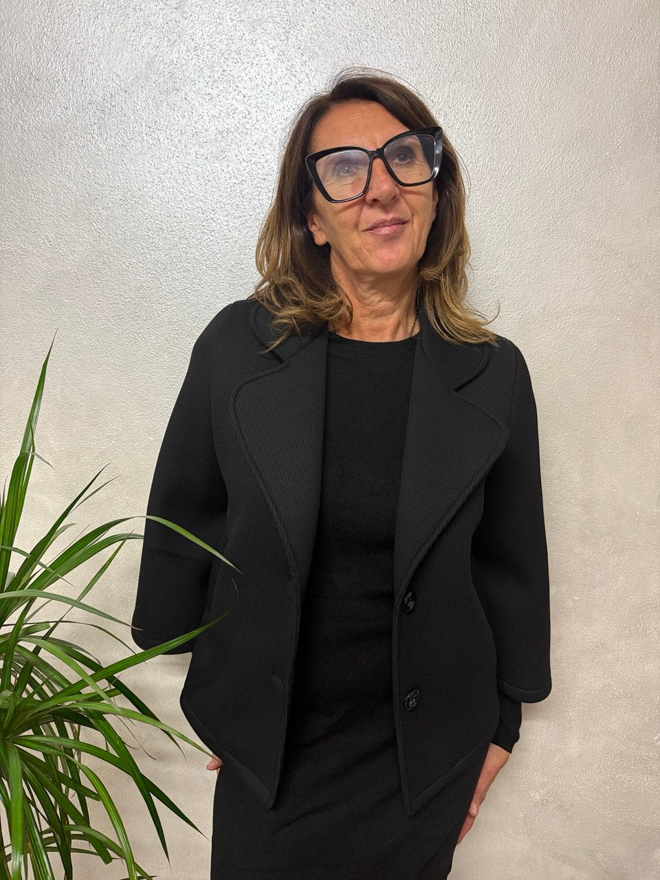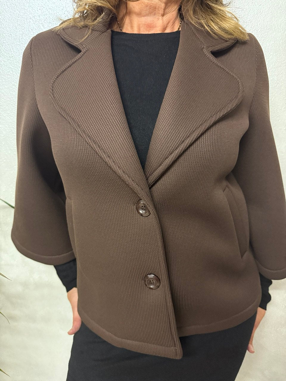 Neoprene con collo sport, chiusura a due bottoni, manica a 3/4, tasche, lunghezza primo fianco, vestibilità dalla taglia 42 alla 46