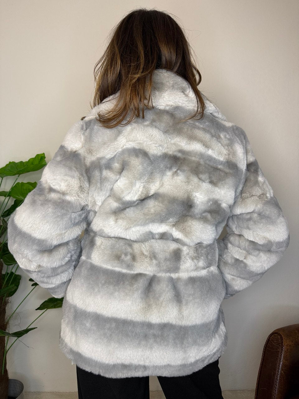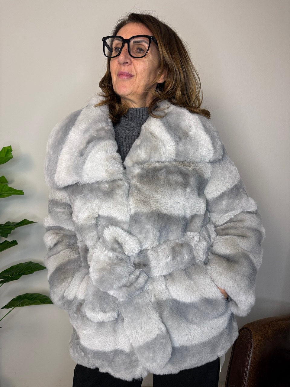 Pelliccia foderata ecologica con collo ampio, pelo sfumato dal grigio chiaro al grigio scuro, due ganci di chiusura, tasche, cintura regolabile, vestibilità dalla taglia 42 alla 46 abbondante