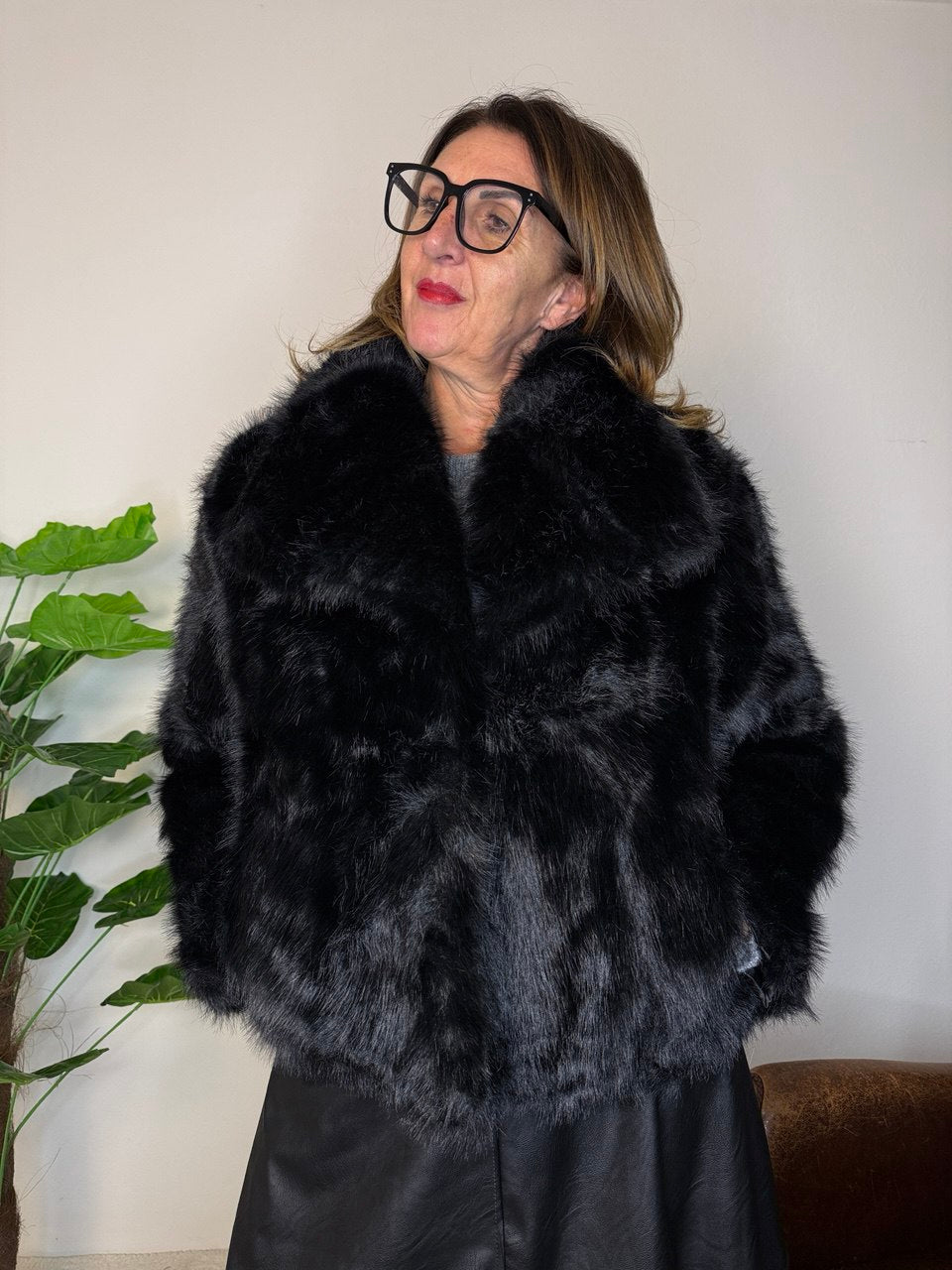 Pelliccia foderata con collo grande, chiusura a due bottoni, tasche laterali, vestibilità morbida, vestibilità dalla taglia 44 alla 48