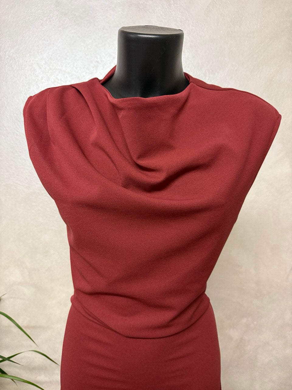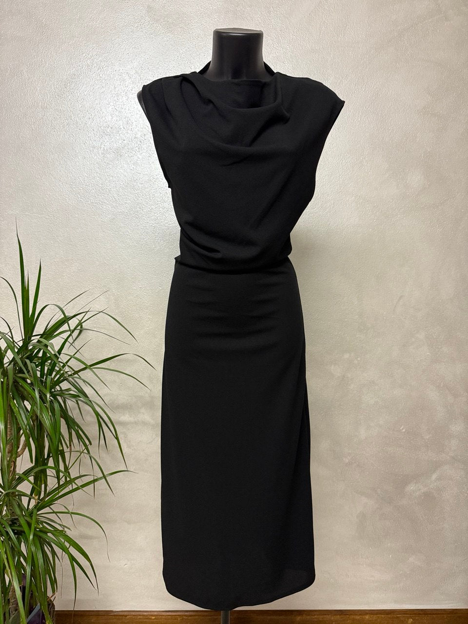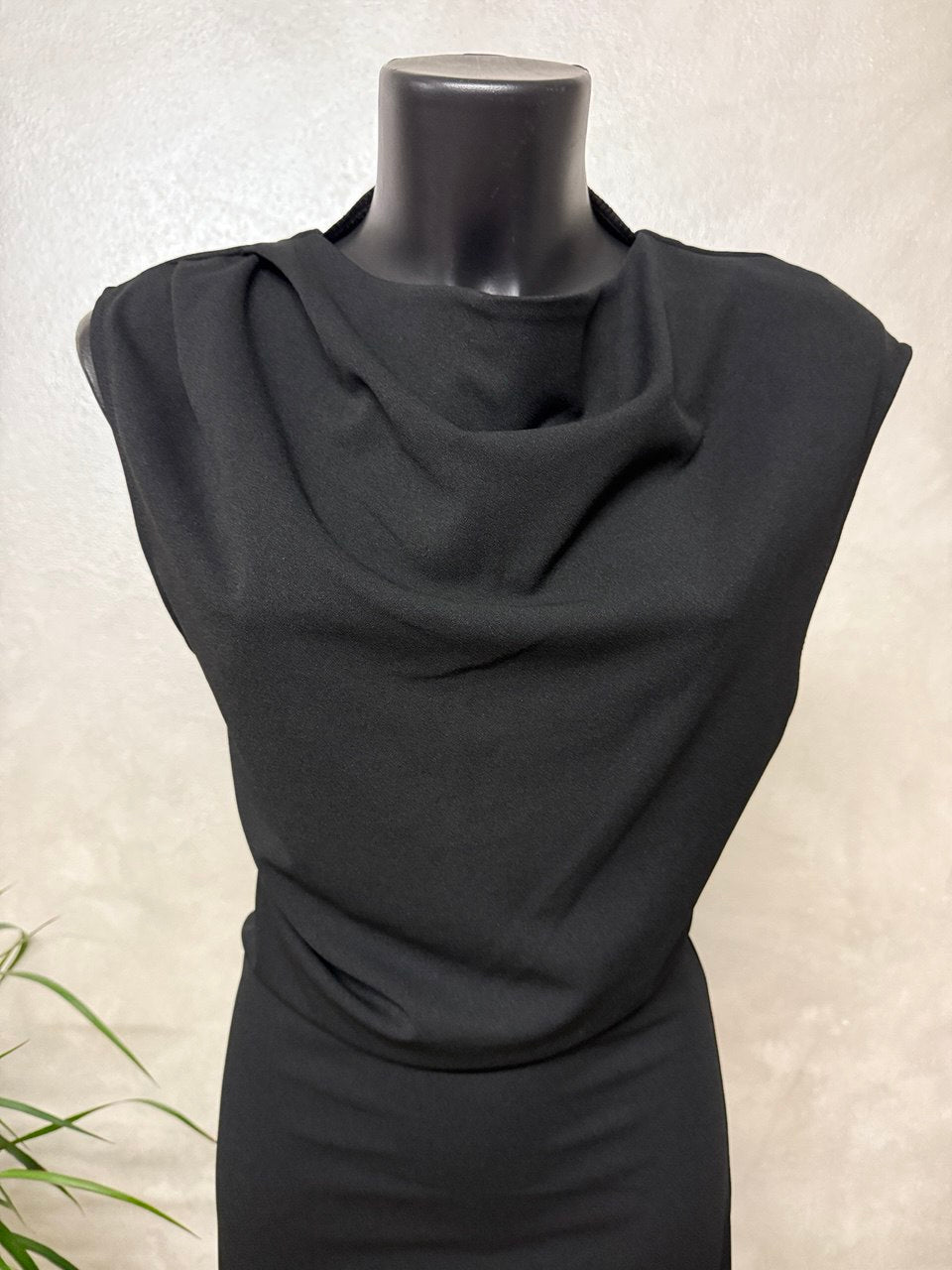 Tubino in tessuto elasticizzato, a spalla larga, drappeggio sulla parte destra e sul punto vita, spacco di 34cm sul retro, effetto WOW
